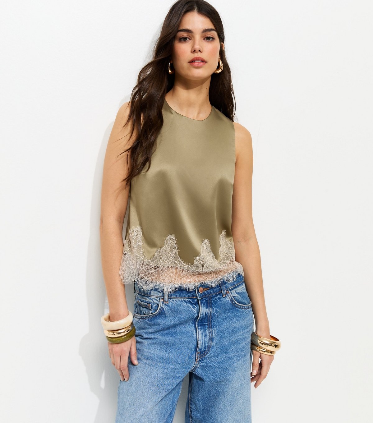 The New Look Light Khaki Satin Lace Hem Sleeveless Top is made from satin, polyester.