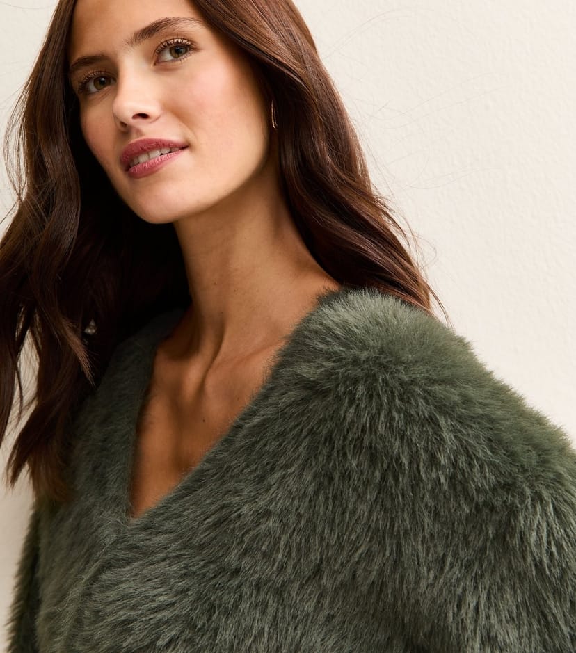 The New Look Light Khaki Fluffy Button Up Cardigan is made from faux fur.