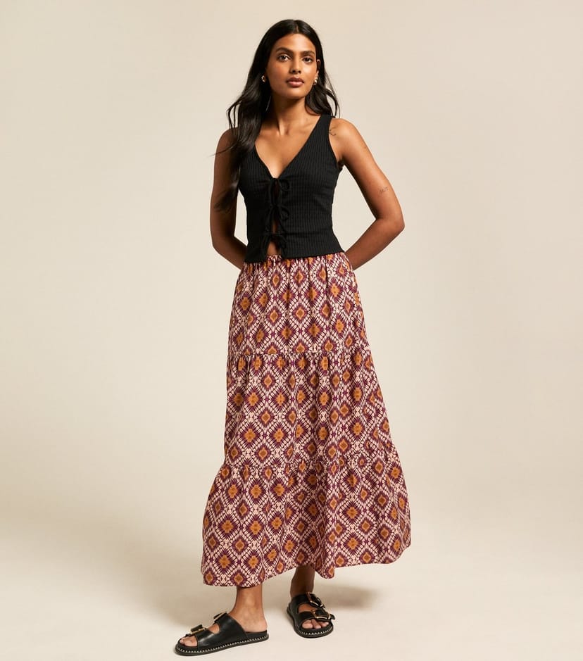 This vibrant midi skirt is perfect for bringing a pop of colour to your wardrobe. Its flowy tiered design and bold diamond pattern combine to make it a lively choice. Ideal for casual outings or adding a touch of flair to your everyday look.