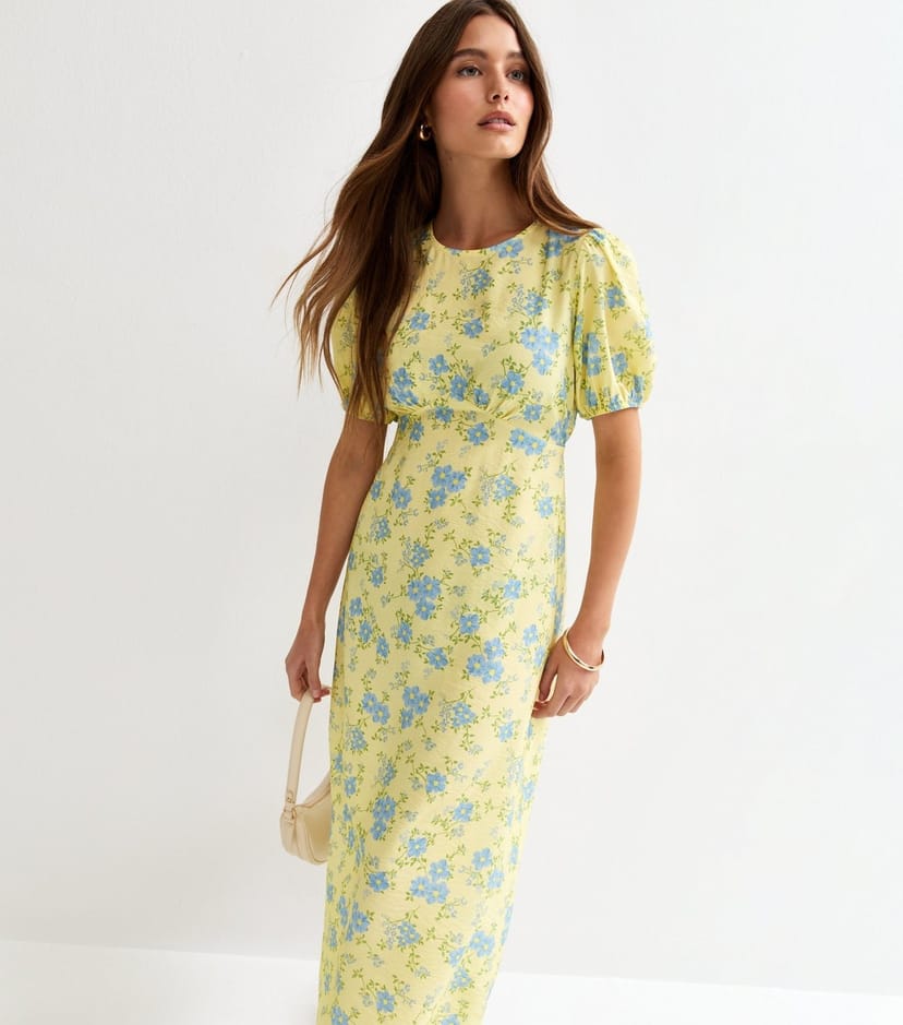 The New Look Light Yellow Floral Midi Dress is available in sizes 10, 12, 14, 16, 18, 20, 22, 6, 8.