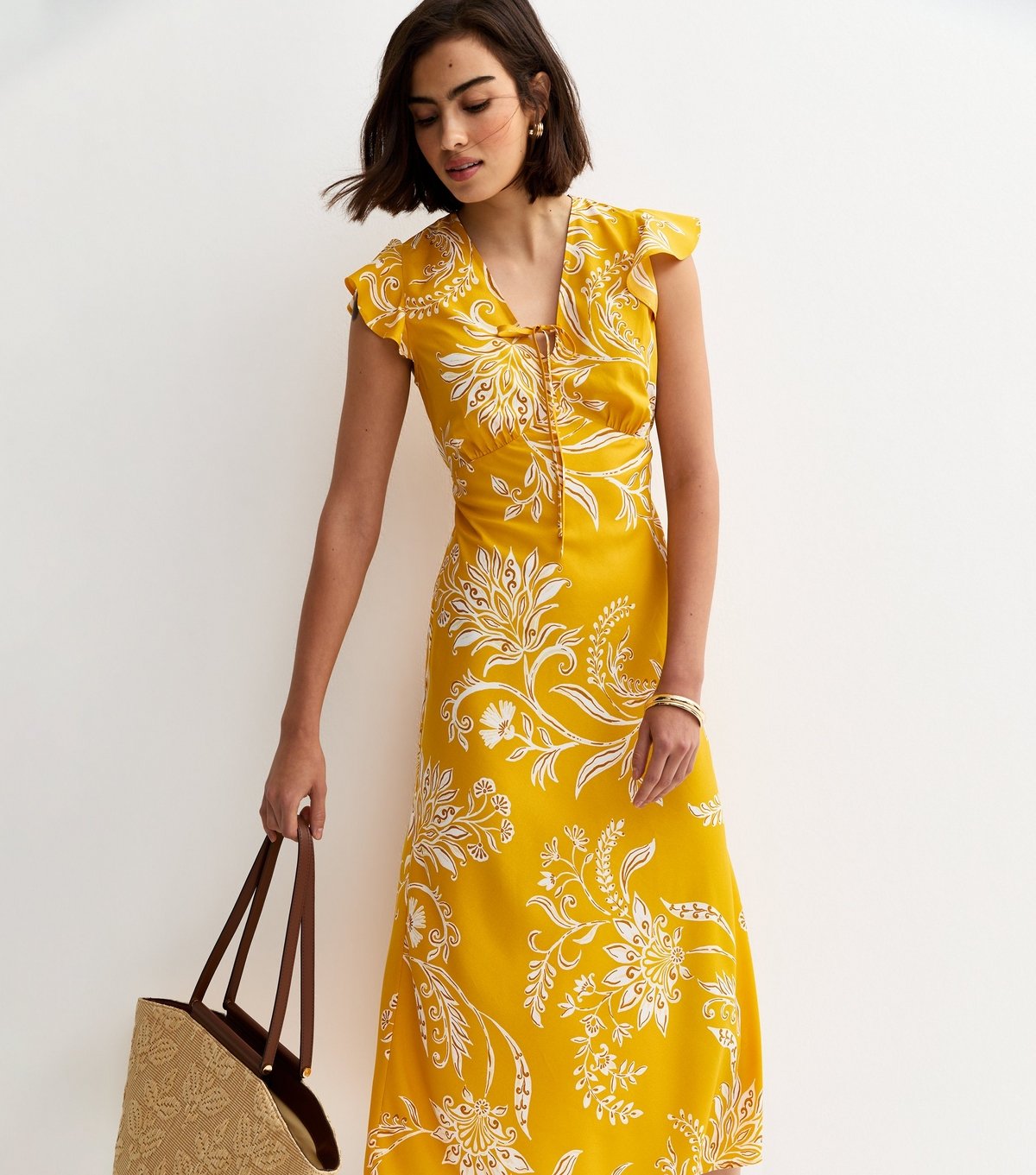 The New Look Yellow Floral Flutter Sleeve Midi Dress is available in sizes 12, 14, 16, 18, 20, 22, 8.