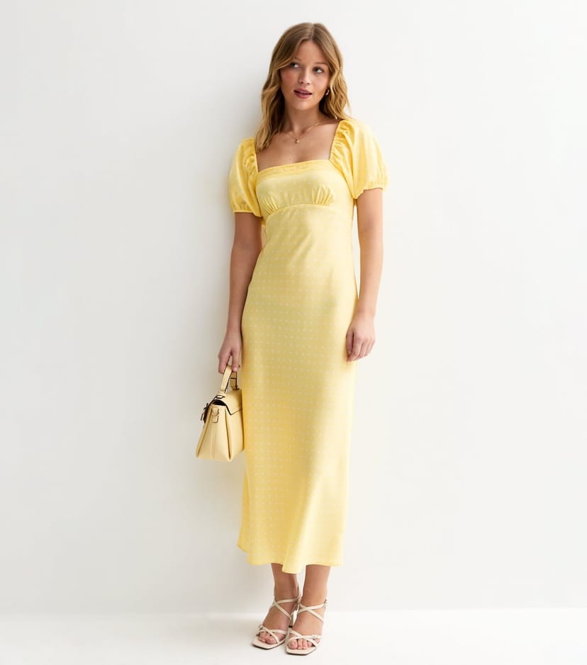 The New Look Yellow Polka Dot Puff Sleeve Midi Dress is available in sizes 10, 12, 14, 16, 18, 20, 6, 8.