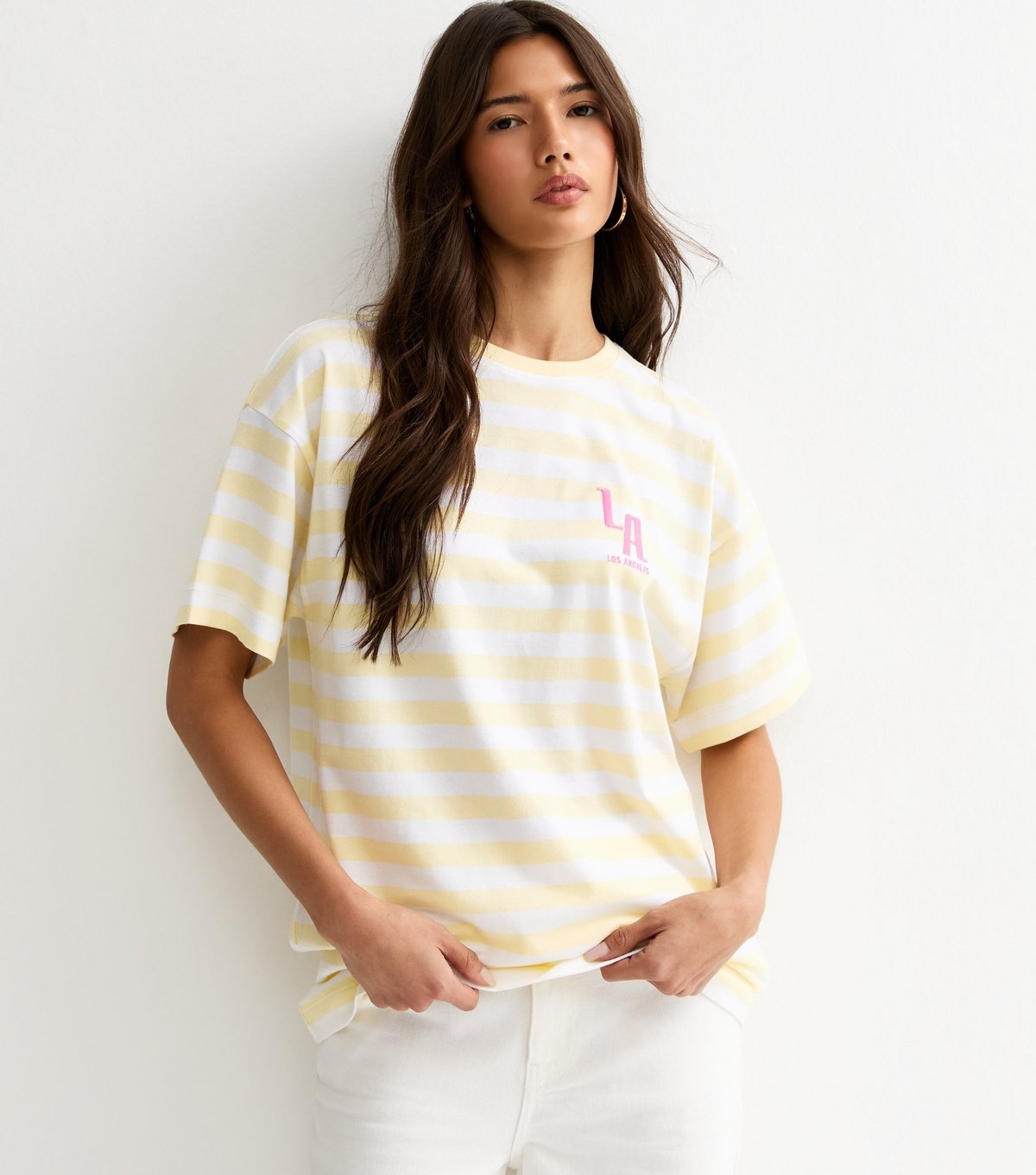 Brighten up your wardrobe with this oversized t-shirt from New Look. Featuring a yellow and white striped print with a contrasting pink 'LA' print on the left side. Made from soft jersey fabric for a comfortable fit.