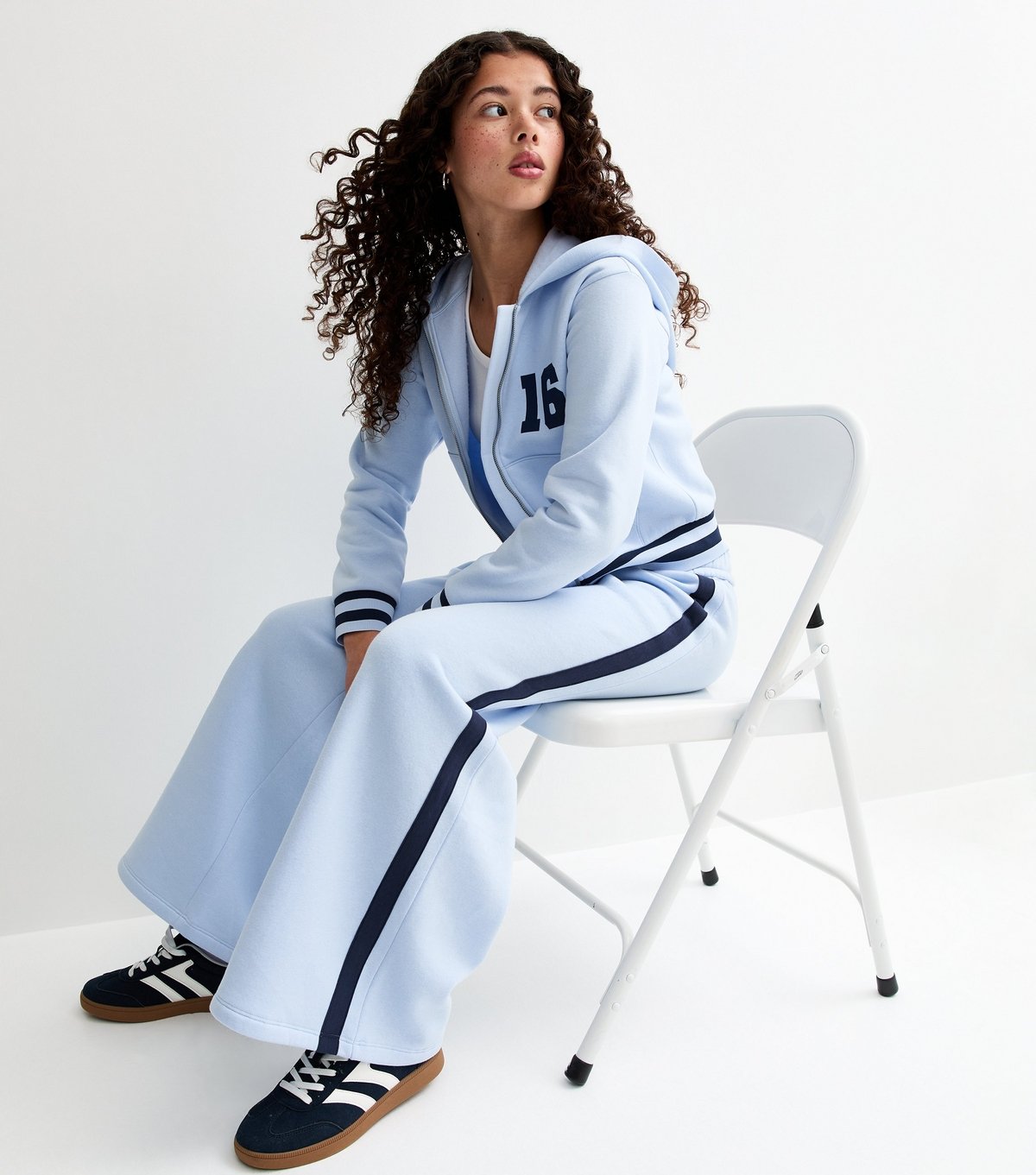 Trendy light blue joggers from New Look featuring a fold-over waistband and a contrasting side stripe. Made from soft jersey fabric, these joggers offer a relaxed fit and are perfect for casual wear.