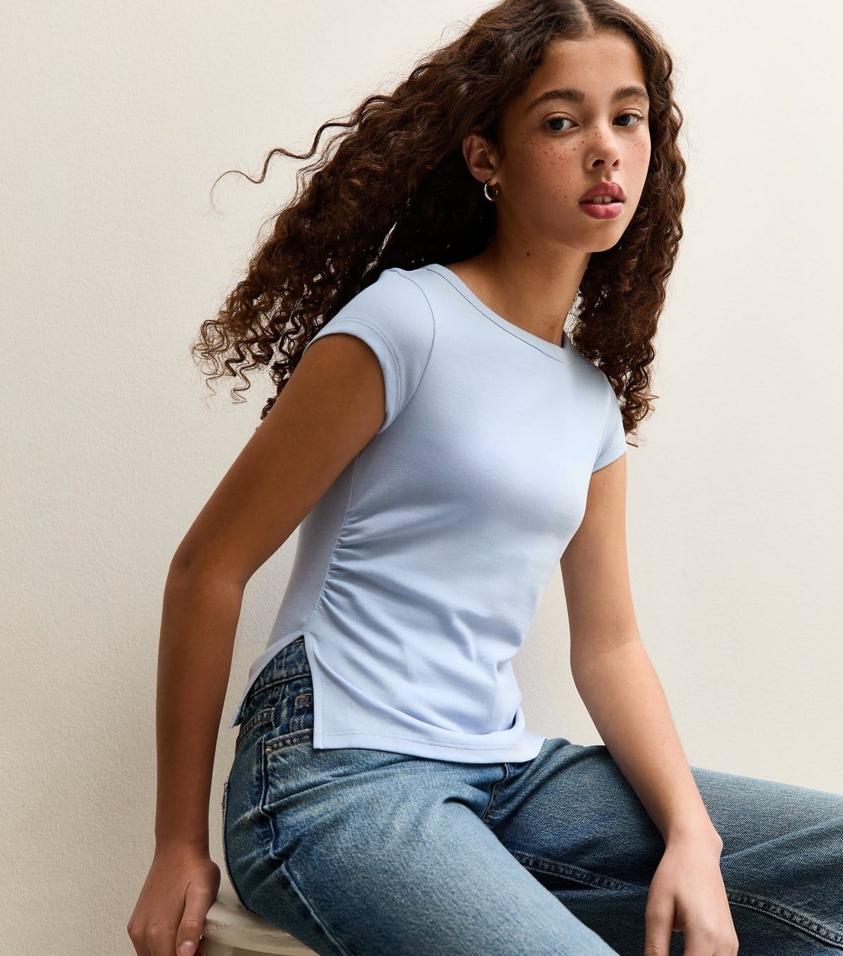 Stylish light blue jersey top with a slim fit and cap sleeves. Features side ruching leading to slits for a casual yet chic look. Perfect for everyday wear.