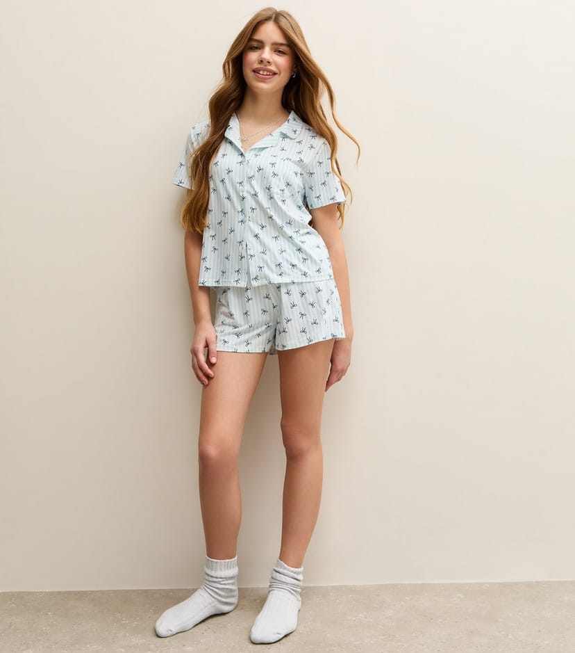 The New Look Pale Blue Jersey Bow Print Pyjama Set is available in sizes 10-11 years.