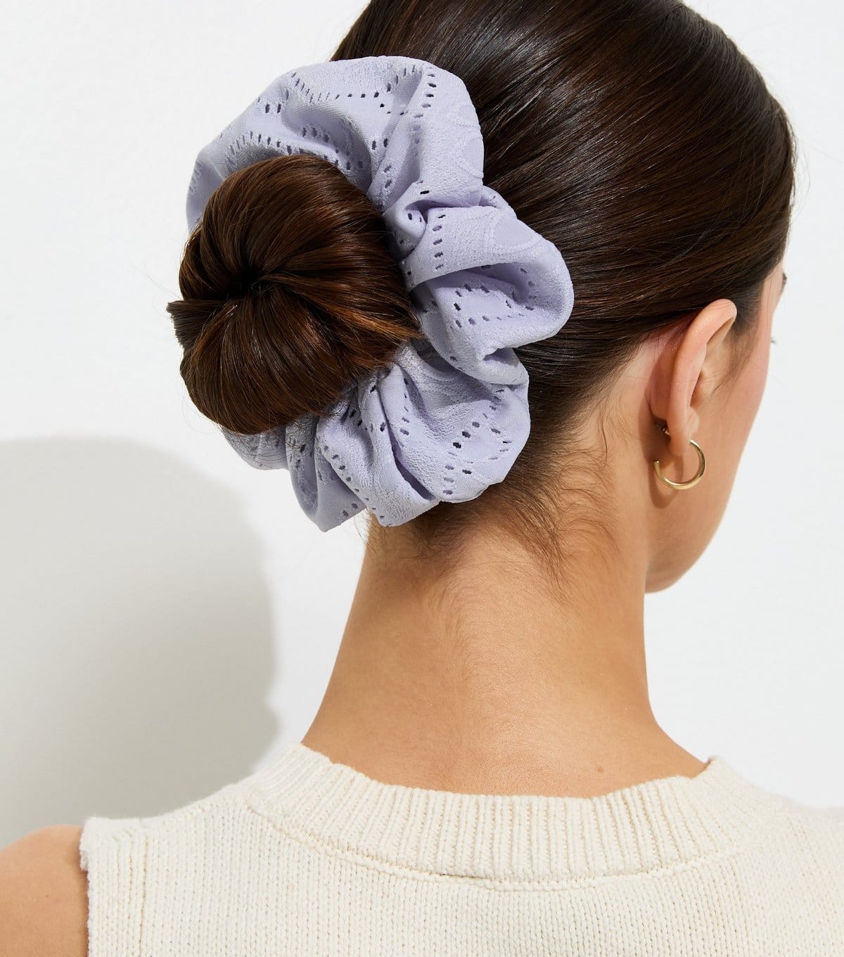 This light blue broderie anglaise scrunchie adds a fresh touch to your summer outfits. Its oversized design and cut-out pattern make it a unique accessory. Perfect for casual and beachy looks.