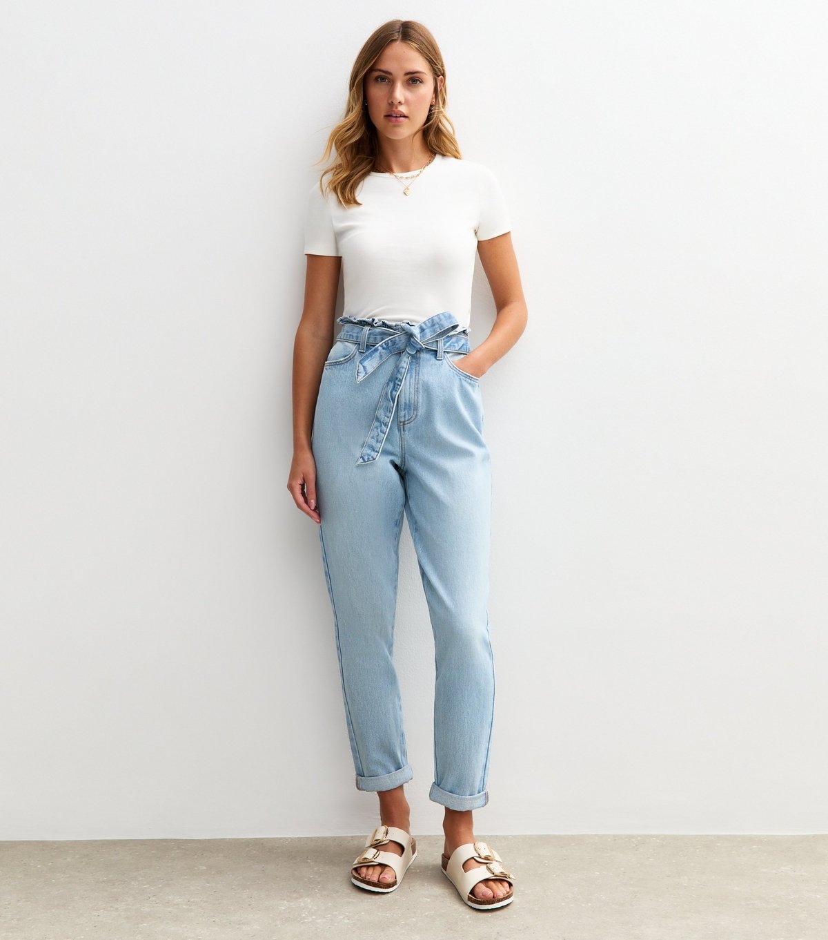 The New Look Pale Blue Paperbag Waist Barrel Jeans is available in sizes 6L30.