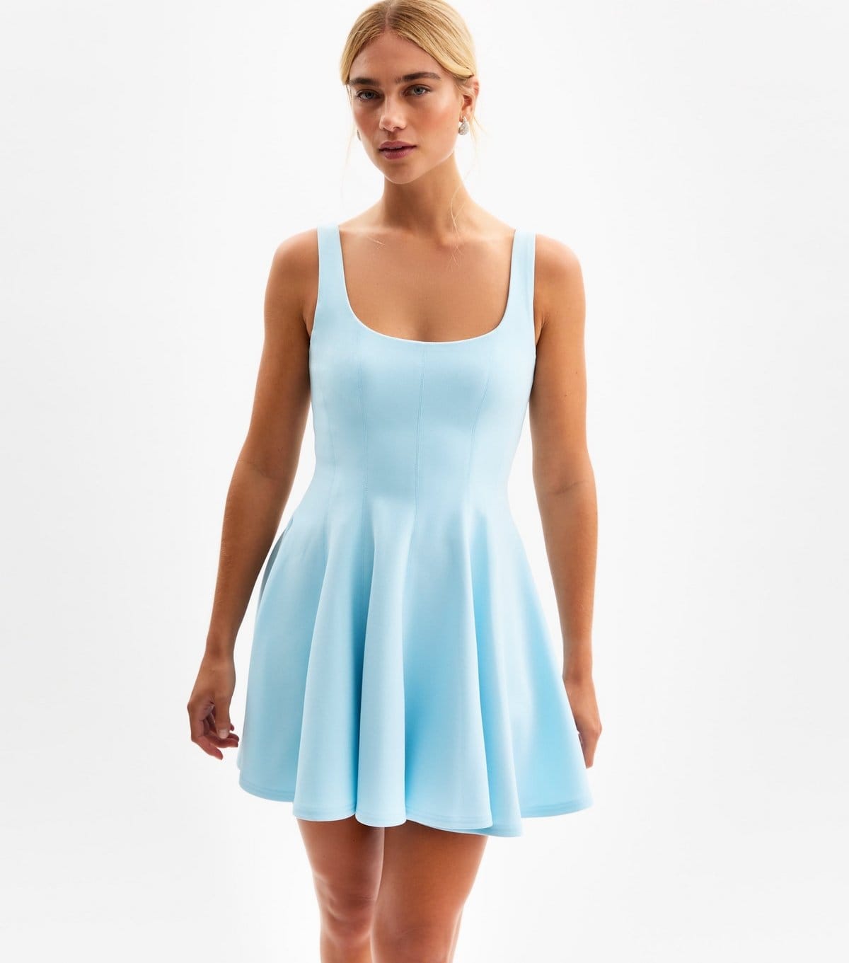 This pale blue crepe mini dress features a square neckline and a flattering fit-and-flare silhouette. Ideal for summer occasions with its light and elegant design.
