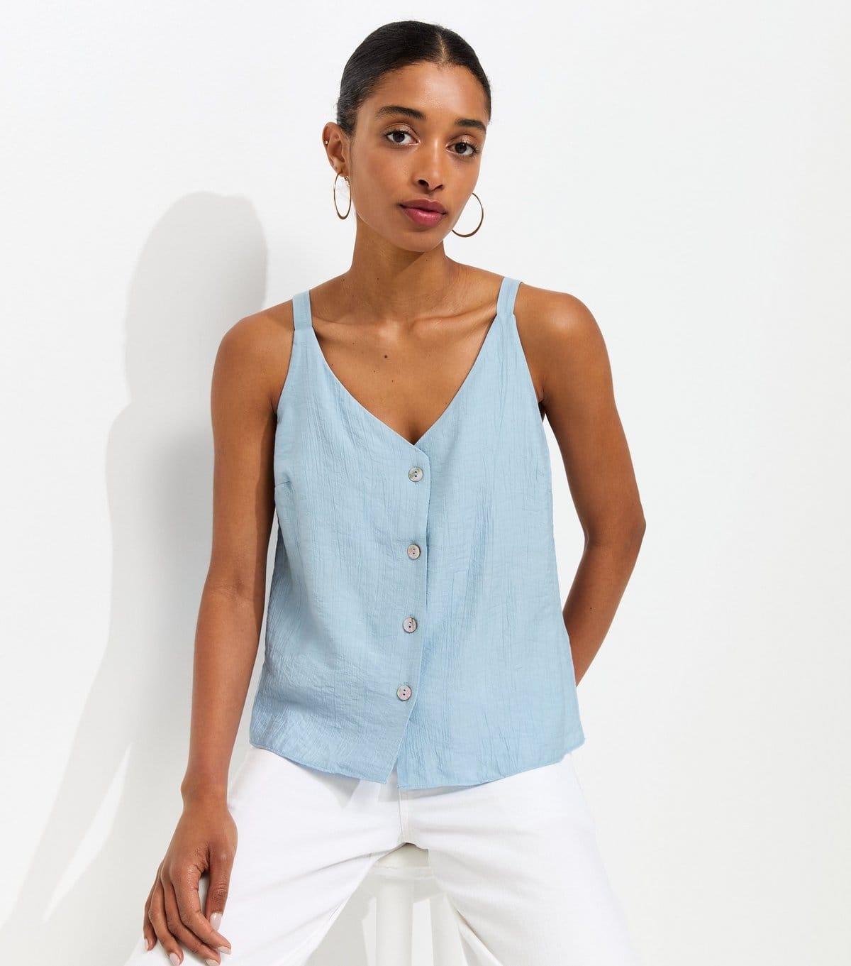 A fresh take on a classic silhouette, this light blue button-front cami top is perfect for sunny days. Pair it with your skirt or trousers for an effortlessly stylish look.