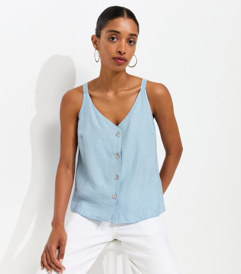View New Look UK's returns policyA fresh take on a classic silhouette, this light blue button-front cami top is perfect for sunny days. Pair it with your skirt or trousers for an effortlessly stylish look.