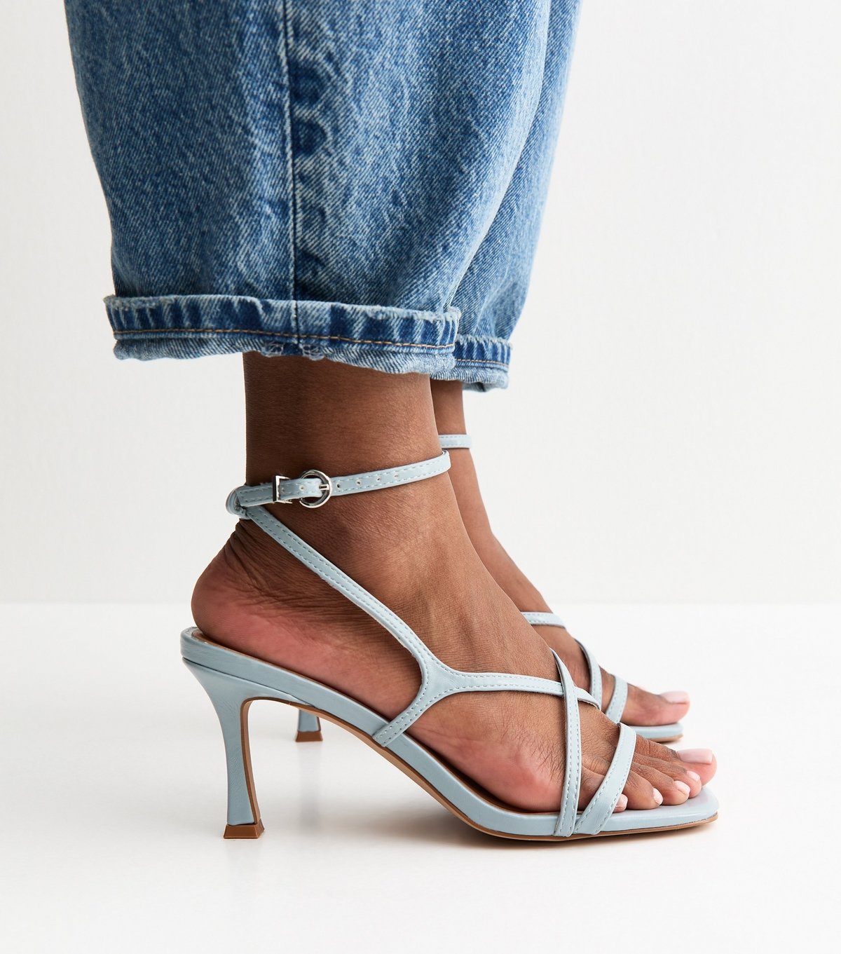 The New Look Light Blue Faux Leather Stiletto Sandals is available in sizes 3, 4, 5, 6, 7, 8, 9.