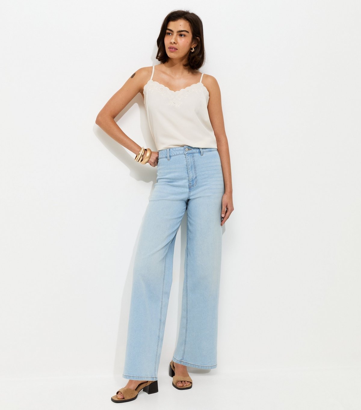 Stylish pale blue high waist stretch denim jeans by New Look. Designed with a flattering wide leg cut, these jeans are a versatile and stylish addition to any wardrobe. Made from comfortable stretch denim, perfect for year-round wear.