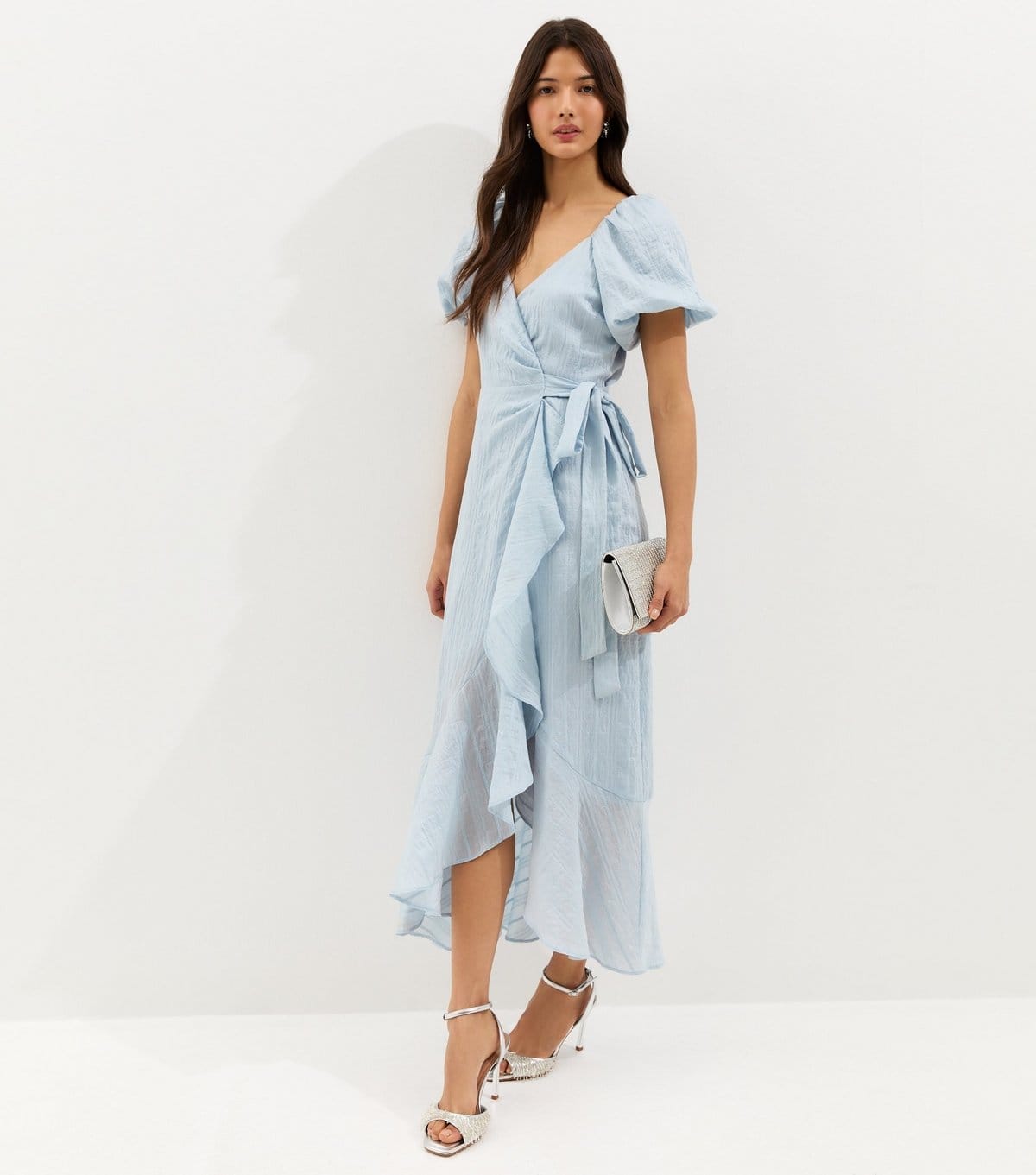 This light blue midi dress features a wrap silhouette with voluminous puff sleeves and a textured fabric. Ideal for summer events, its flowy hem adds a touch of elegance.