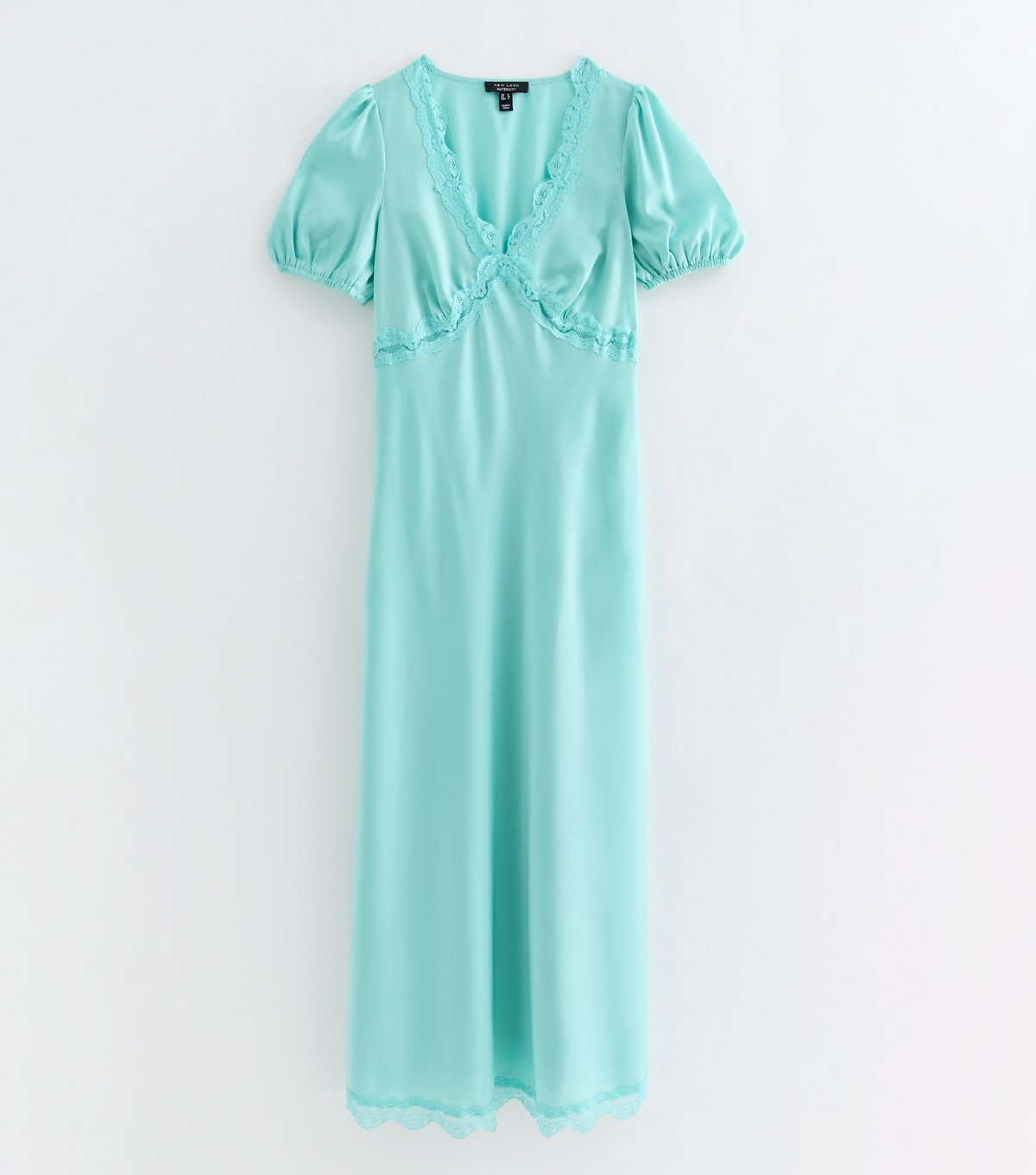 The New Look Light Blue Lace Trim Satin Midi Tea Dress is available in sizes 10, 12, 14, 16, 18, 20, 8.