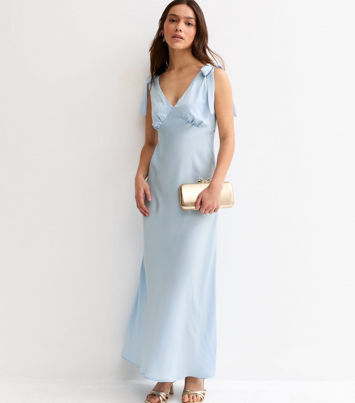 View New Look UK's returns policyFeel graceful in this light blue satin midi dress. It has tie straps at your shoulder and a back tie to accentuate the a-line silhouette of the dress. Perfect for special occasions.