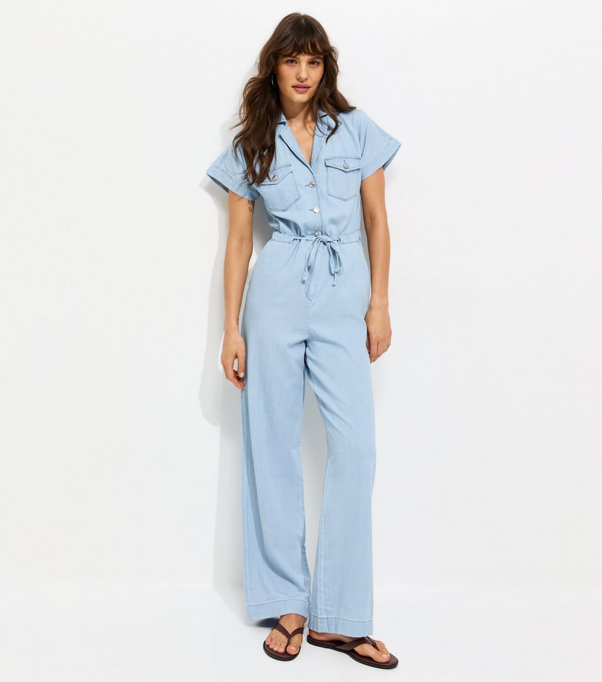 View New Look UK's returns policyEffortlessly stylish light blue denim jumpsuit designed for taller frames. Features a flattering tie waist and wide leg silhouette. Perfect for casual outings or relaxed daywear.