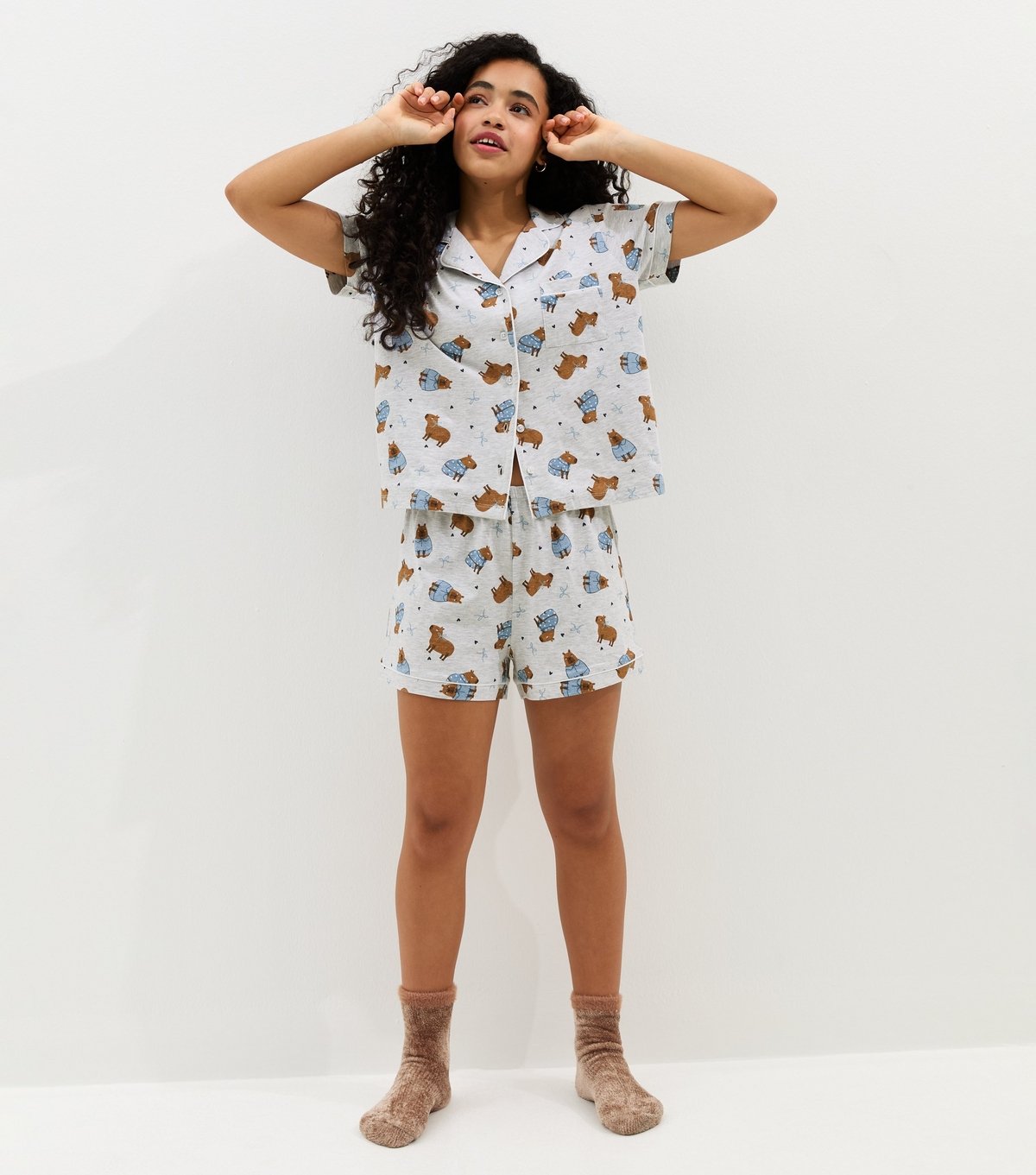 Charming light grey capybara print pyjama set from New Look. The jersey top features a revere collar while the shorts have an elasticated waist. Ideal for a cozy night in.