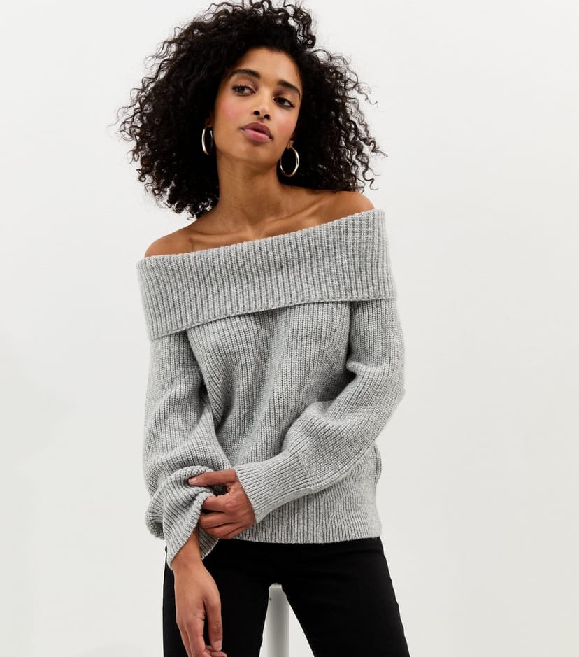 The New Look Light Grey Ribbed Bardot Knit Jumper is available in sizes 10, 18, 20.