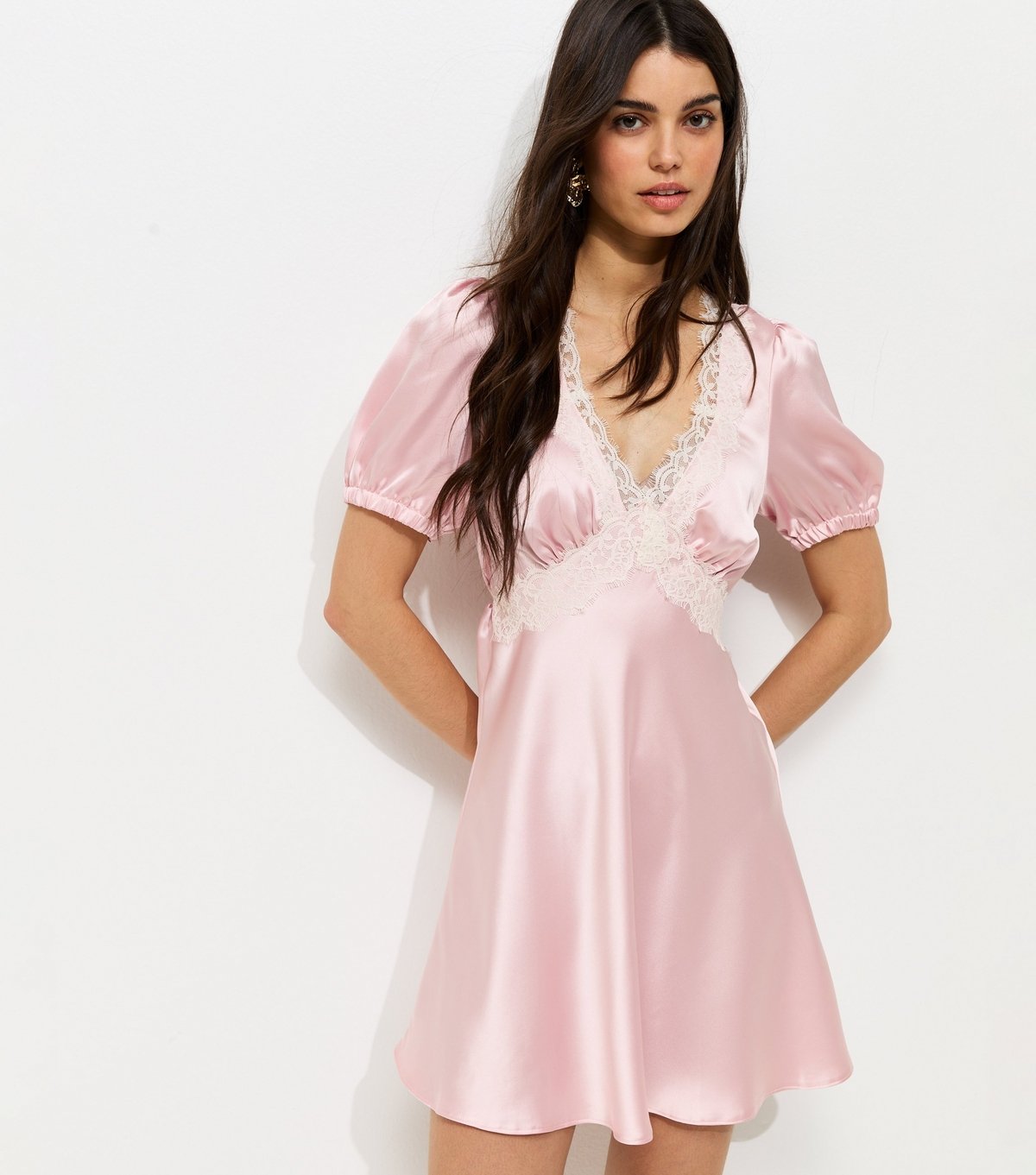 The New Look Light Pink Satin Lace Trim Mini Dress is made from satin, lace.