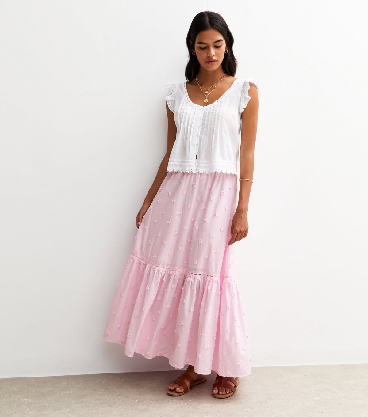 Charming midi skirt with three-dimensional floral embroidery in pale pink. Its tiered shape is perfect for summer styling. Made from woven fabric with a relaxed fit.