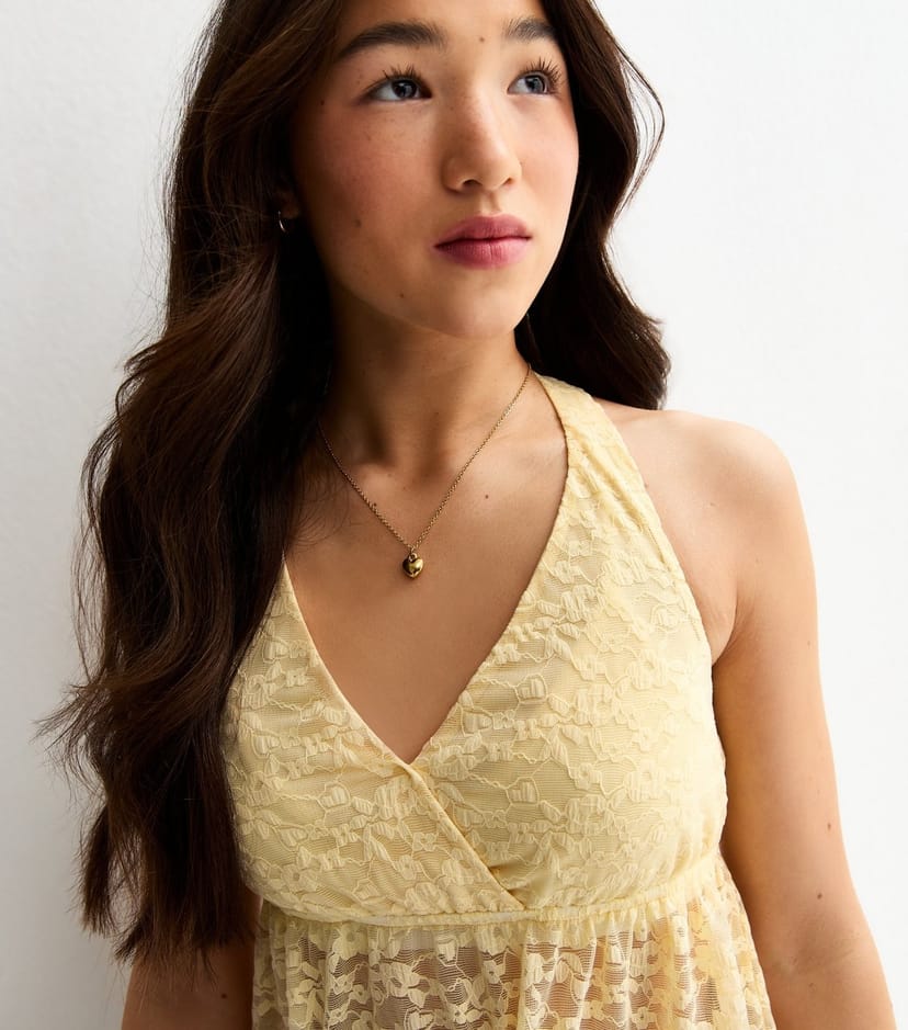 The New Look Light Yellow Lace Halter Neck Top is available in sizes 10-11 years, 12-13 years, 14-15 years, 9 years.