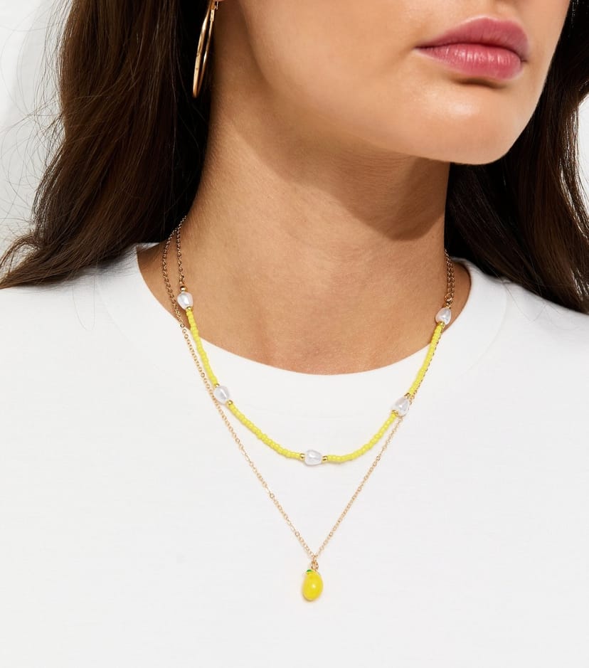 This two-layer necklace features a glimmering chain and bright yellow beads with a zesty lemon charm. Perfect for adding a pop of colour to summer outfits.