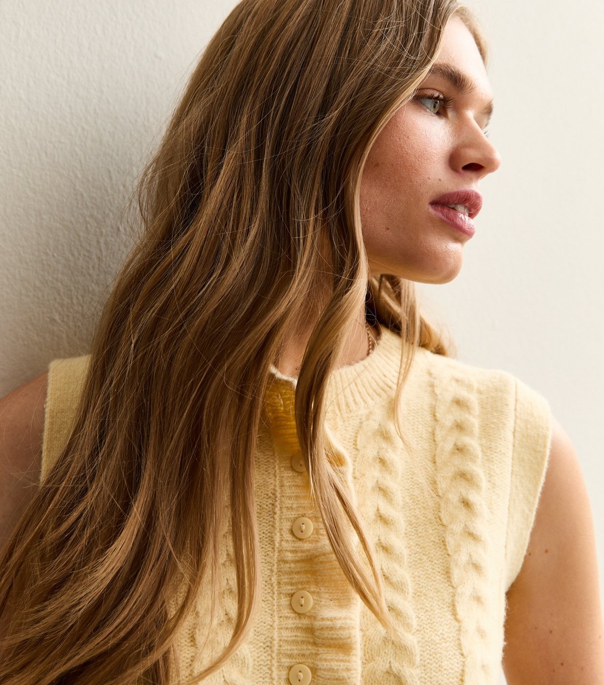 This light yellow cable-knit waistcoat is perfect for casual days. Its flattering cut and refreshing shade make it a cute everyday style. Ideal for layering over tops or dresses.