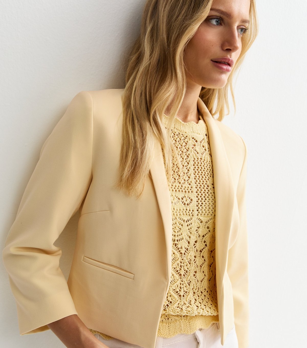 The New Look Light Yellow Cropped Blazer is available in sizes 10, 12, 14, 16, 18, 6, 8.