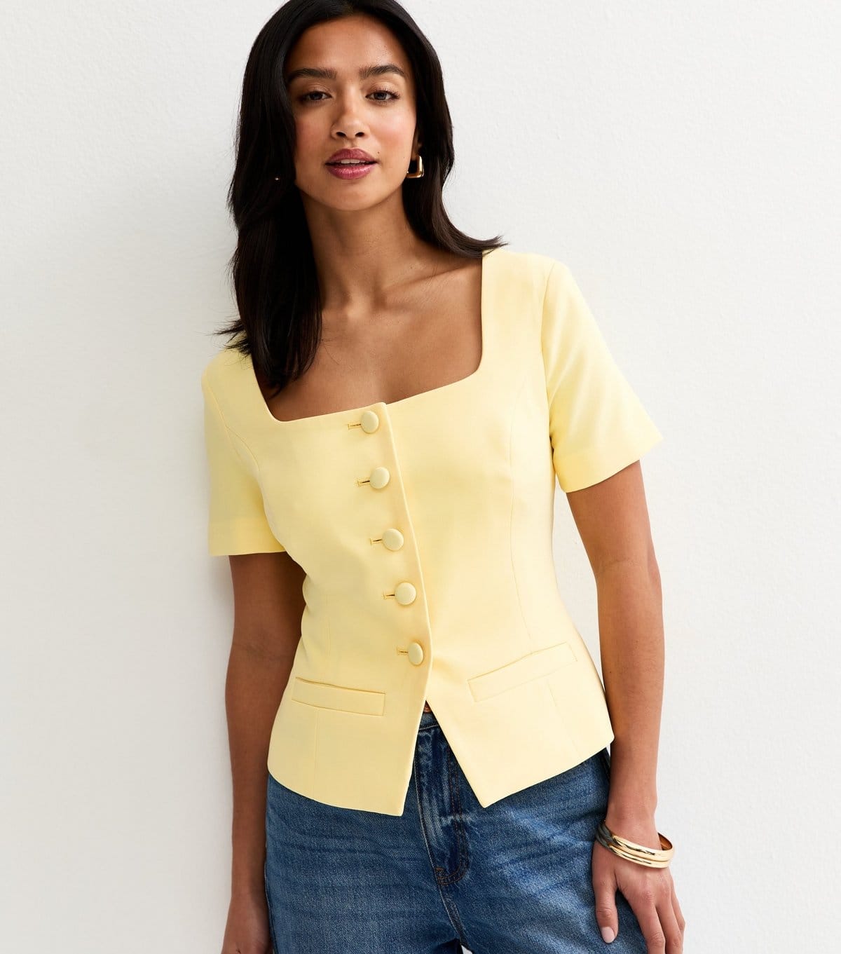 “Pair with navy blue skinny jeans and white ankle boots for a fresh, modern look.”