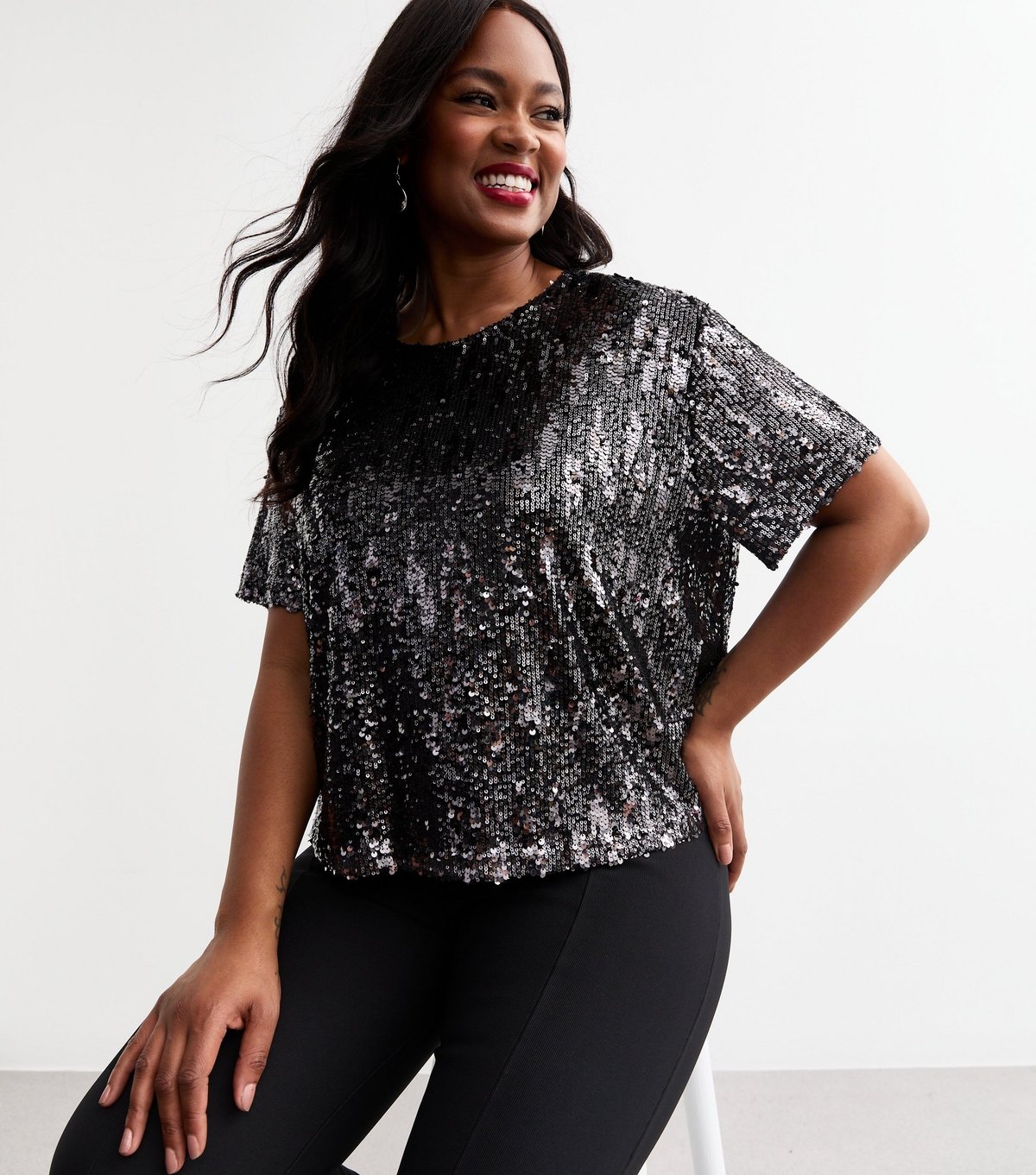 The New Look Pewter Sequinned Boxy Top is available in sizes 22.