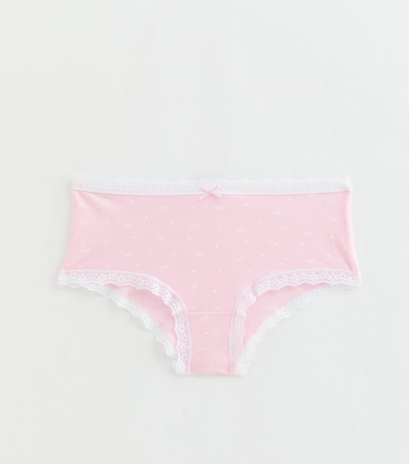 See all outfit ideasComfortable light pink briefs for girls from New Look. Made from stretchy cotton, these shorts feature a cute bow print and lace trim. Ideal for everyday wear.