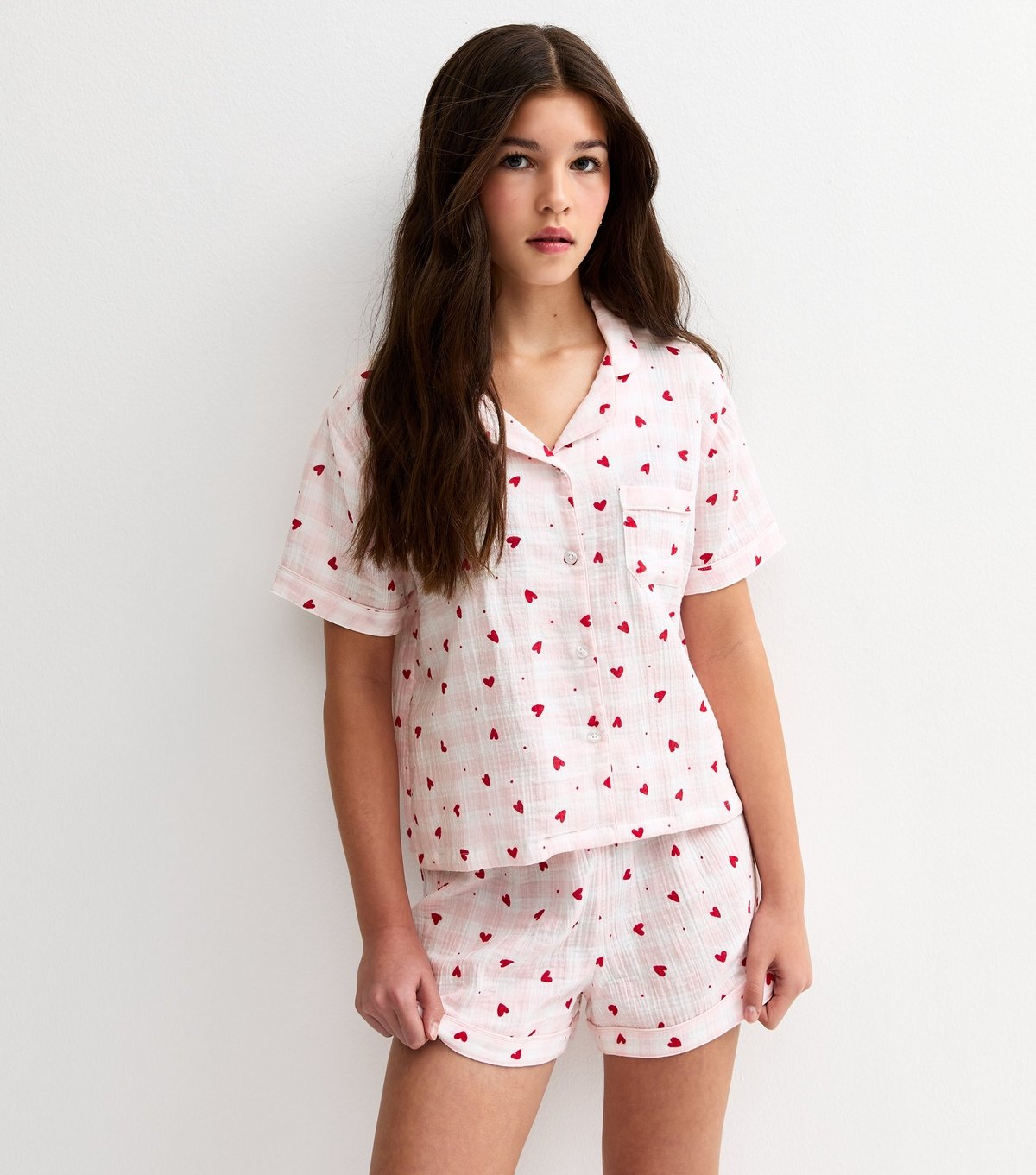 The New Look Pink Heart Print Pyjama Set for Girls is available in sizes 10-11 YEARS, 12-13 YEARS, 14-15 YEARS, 9 YEARS.