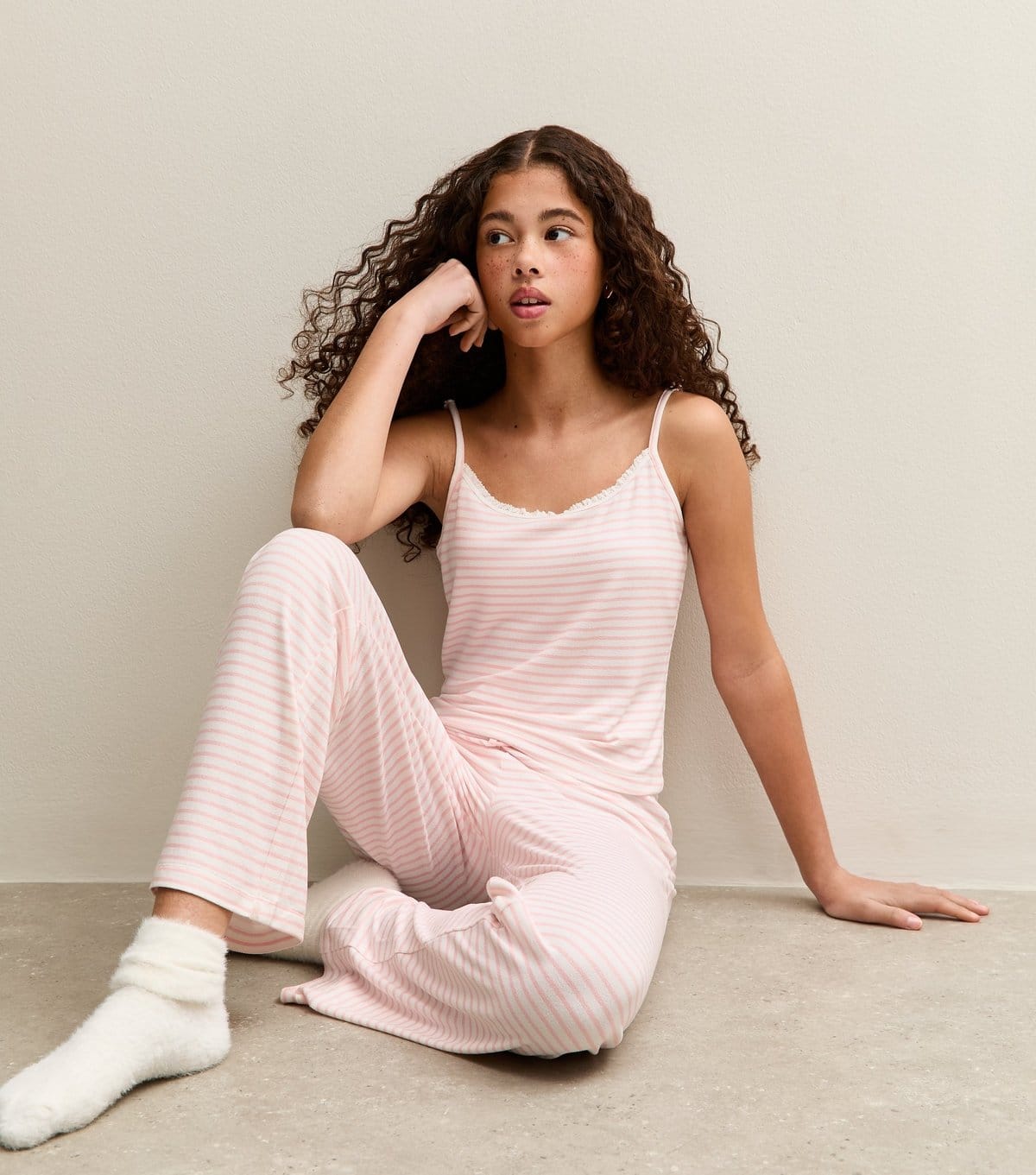 The New Look Pink Striped Cami Top and Wide Legs Pyjama Set is available in sizes 10-11 years, 14-15 years.