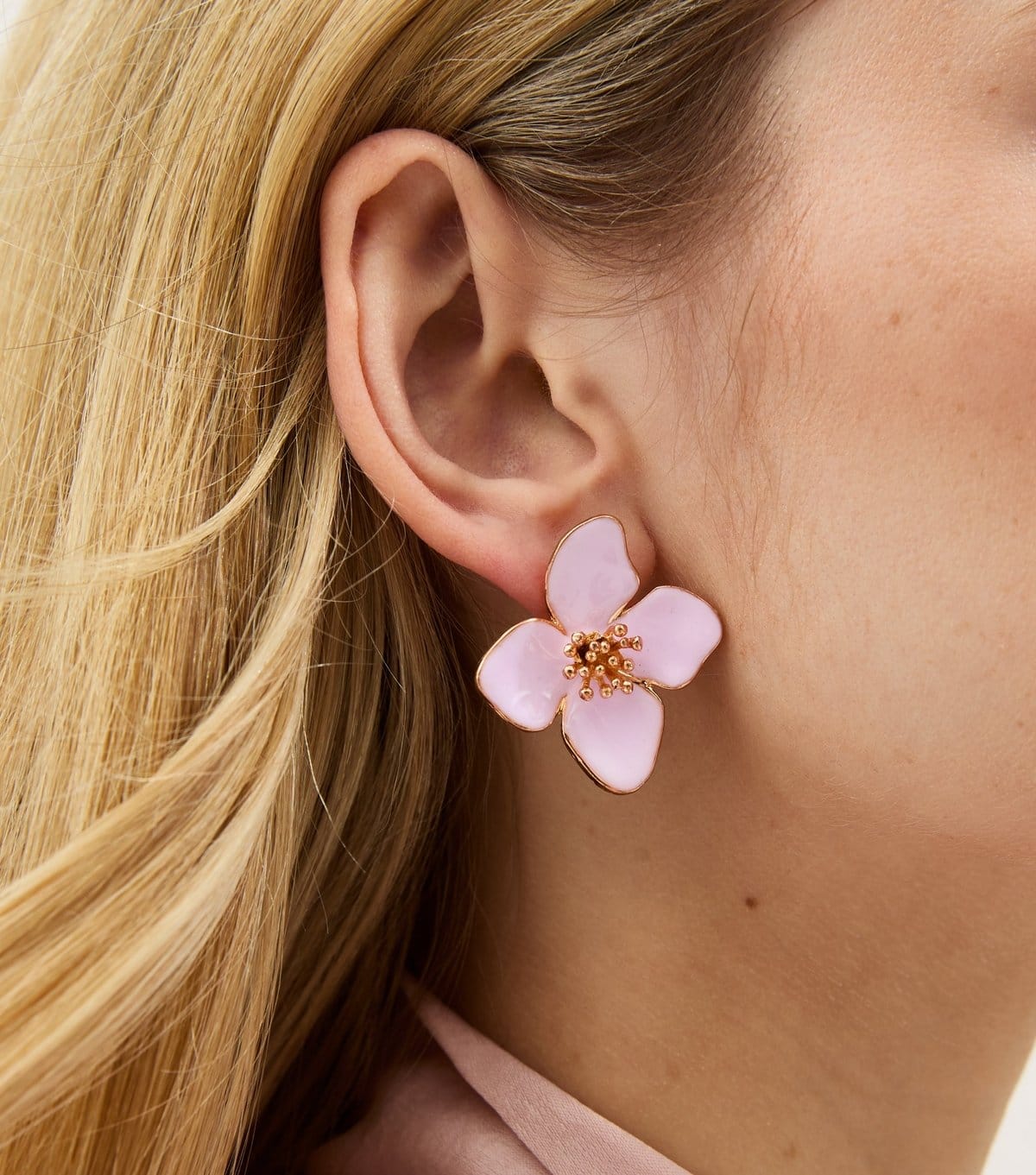 These light pink enamel flower stud earrings will dress up any look. Wear the shiny enamel studs with a simple top or pop them on with your best party dress for a floral pop.