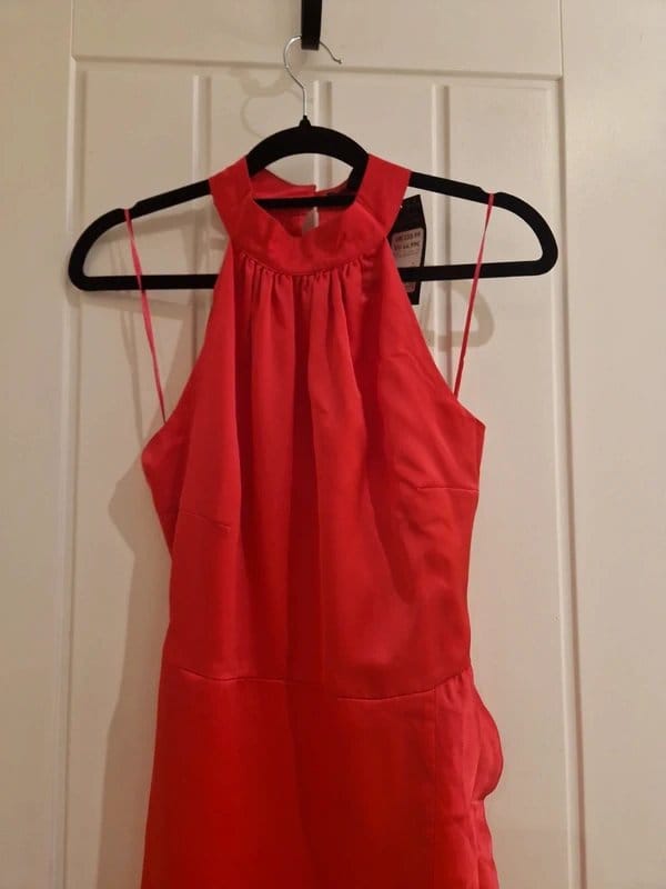 This bright pink halter neck midi dress by New Look features a ruffled neckline and adjustable straps. Made from shiny fabric, it offers a flattering fit and is perfect for evening events or casual outings.