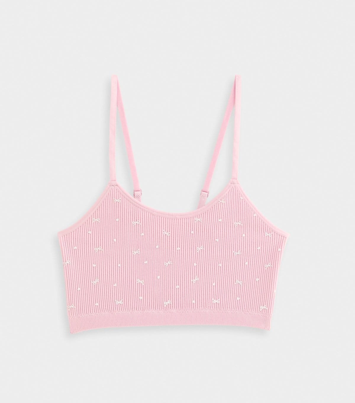 The New Look Pink Bow Print Ribbed Bralette is available in sizes 10-11 years, 12-13 years, 14-15 years.