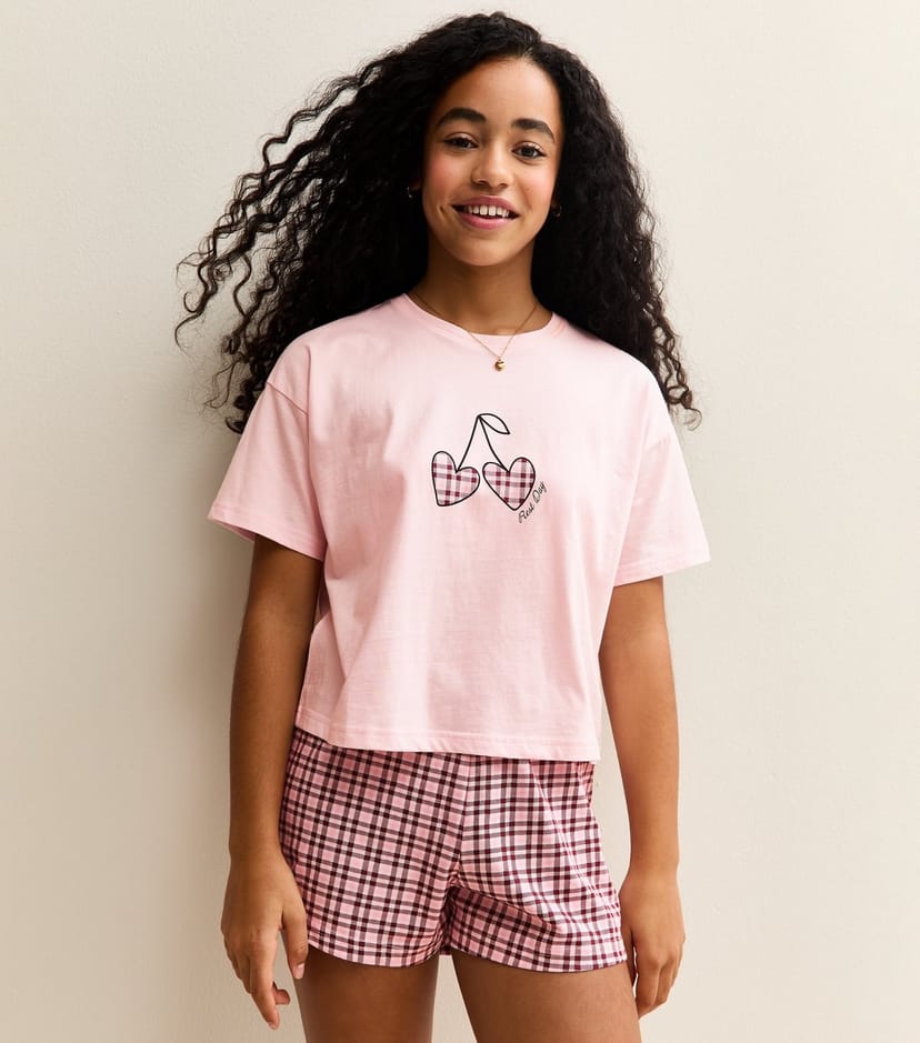 The New Look Pink Check T-Shirt and Shorts Pyjama Set is available in sizes 10-11 years, 12-13 years.