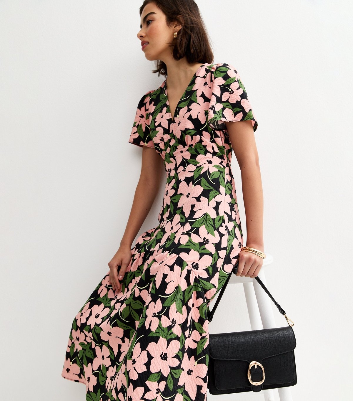 The New Look Green Floral Print Tiered Midi Tea Dress is available in sizes 10, 12, 14, 16, 6, 8.