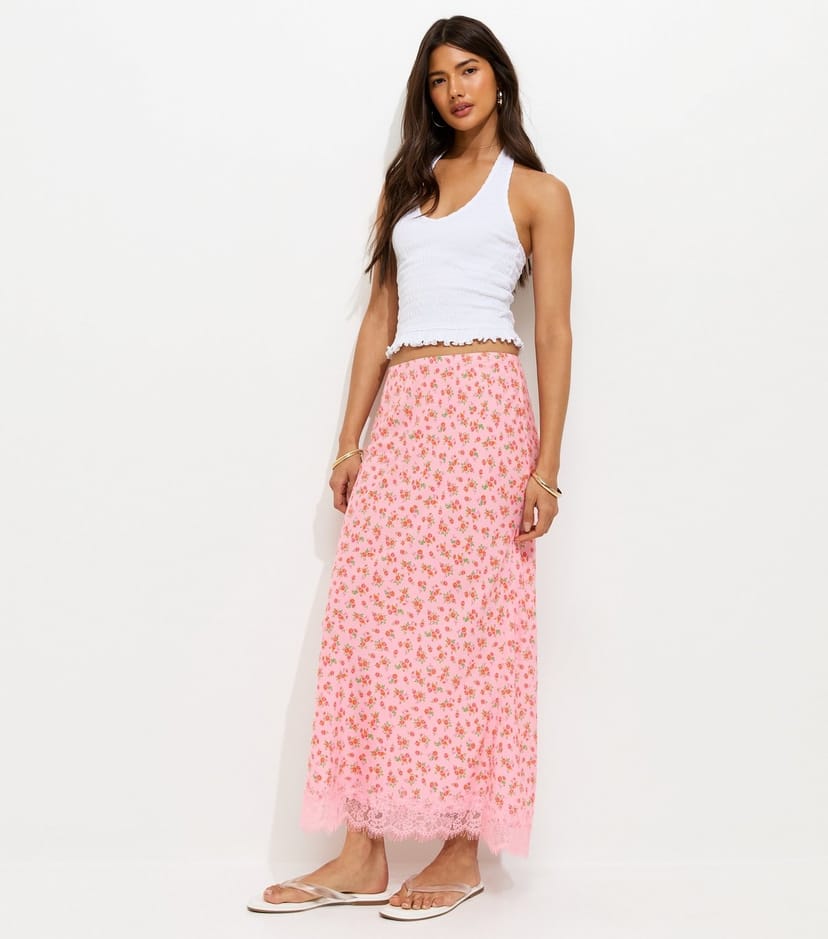 View New Look UK's returns policyThis playful pink maxi skirt features a charming floral print and a pretty lace hem trim. It has a sleek fit and is a dreamy summer styling tool.