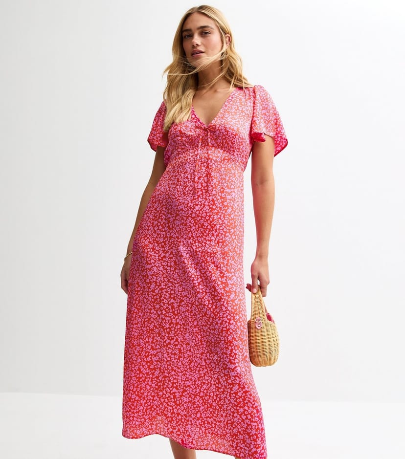 The New Look Pink Floral Satin Midi Dress is ideal for casual, beach, summer event.