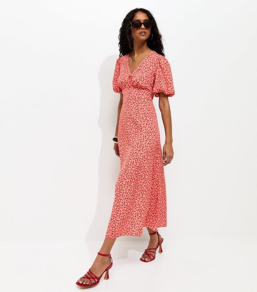 The New Look Pink Rose Print Puff Sleeve Midi Dress is available in sizes 10, 12, 14, 16, 18, 20, 22, 6, 8.