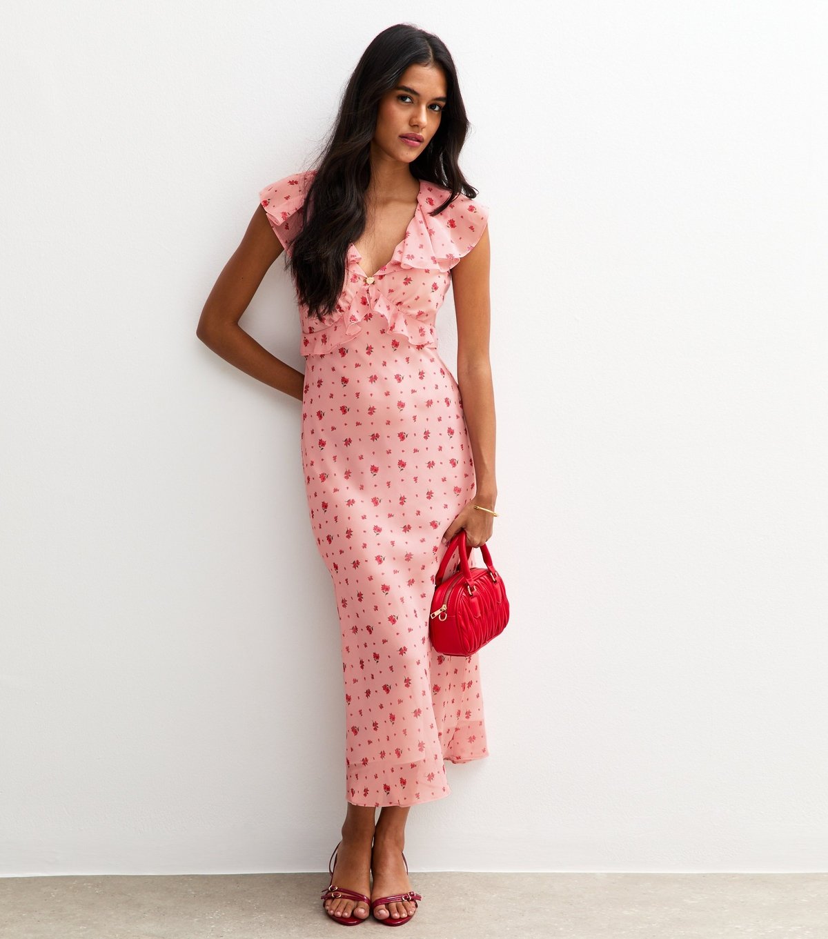 The New Look Pink Rose Print Ruffle Midi Dress is available in sizes 12, 22.