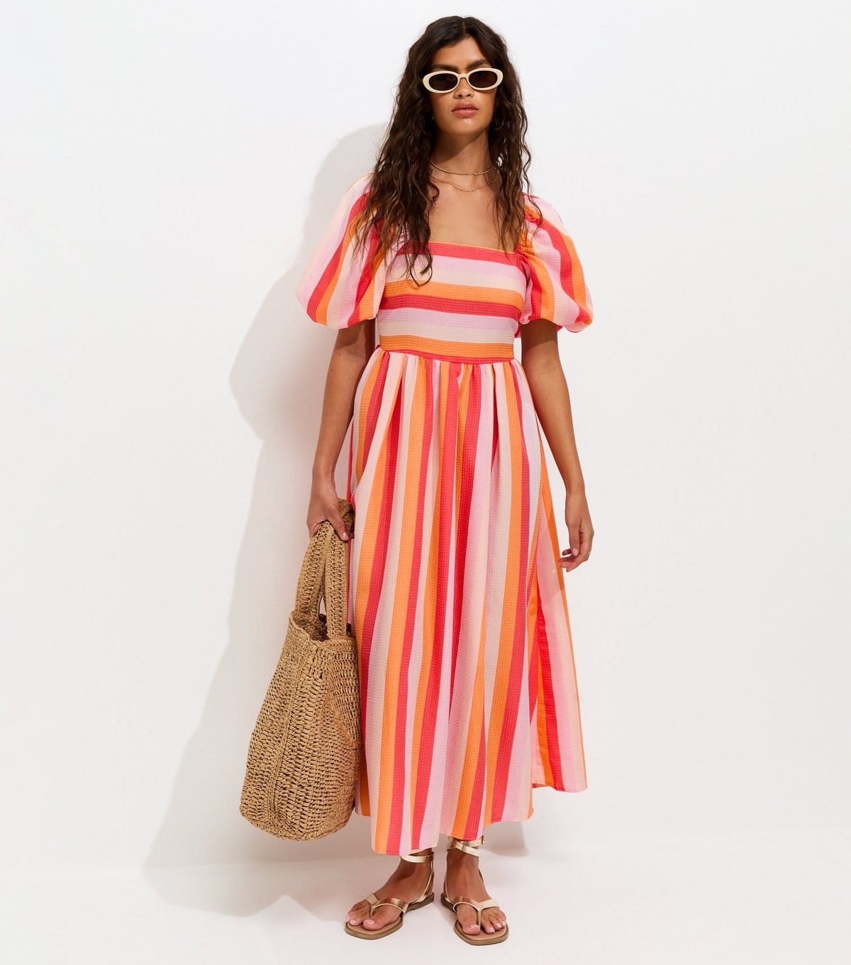 View New Look UK's returns policyThis playful pink stripe midi dress combines a smock fit with a flattering square neckline. The puff sleeves and flared skirt give volume to this vibrant piece. Perfect for casual outings or summer events.