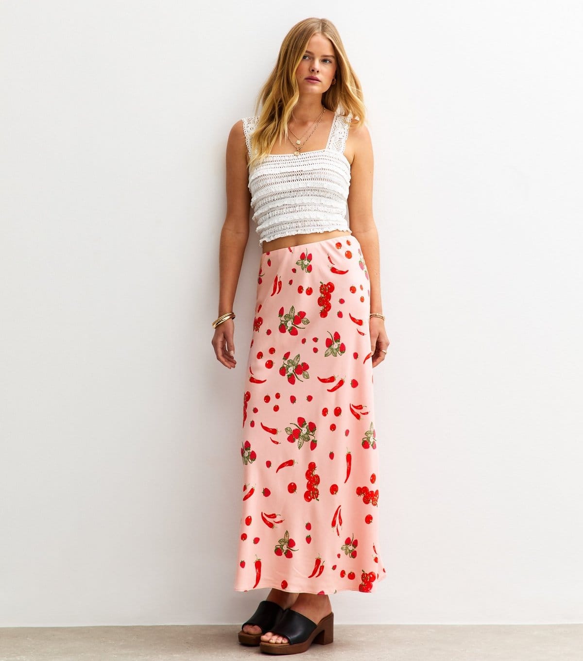 View New Look UK's returns policyPlayful pink midi skirt from New Look featuring a wild strawberry, chilli, and tomato print. Designed with a slim shape and comfortable elasticated waistband, it adds interest to everyday looks.
