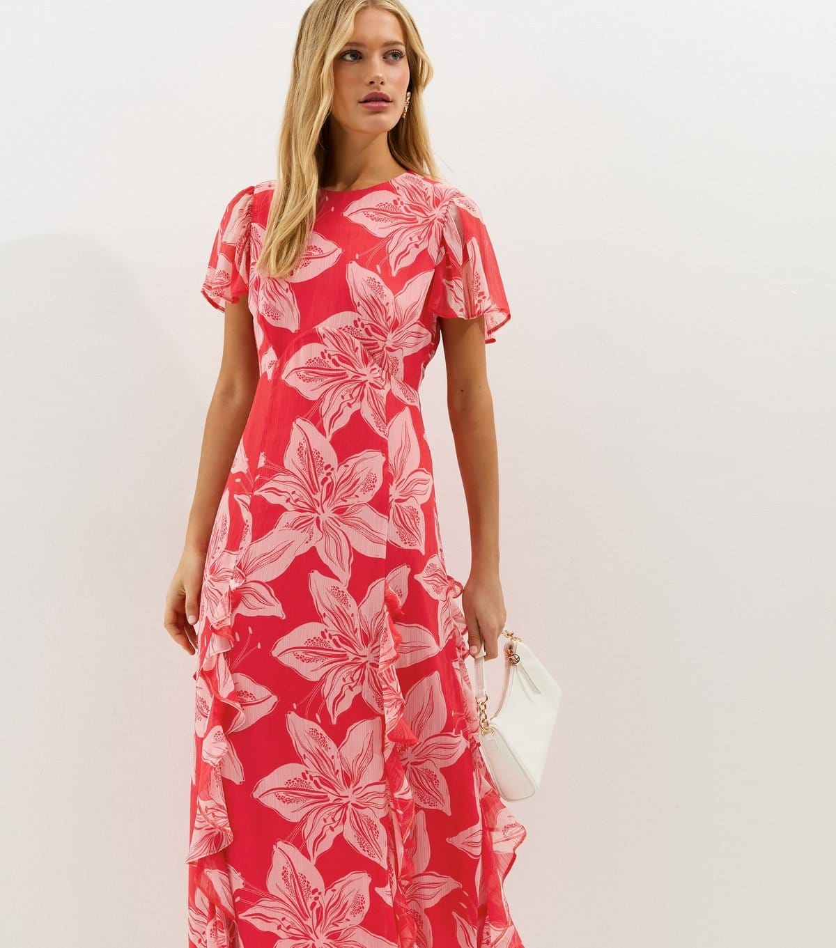 The New Look Red and Pink Orchid Chiffon Midi Dress is available in sizes 10, 12, 14, 16, 18, 20, 22.