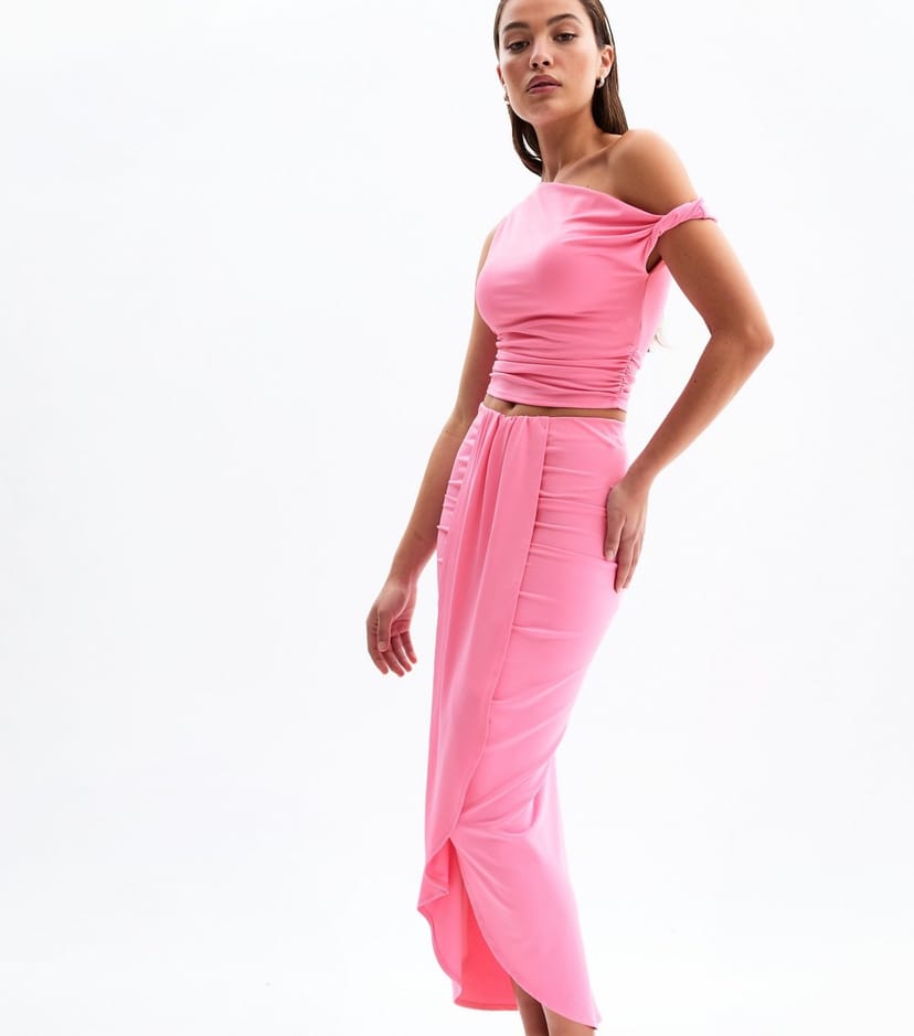 This bright pink jersey midi skirt features a bodycon fit and elegant draped shape with subtle ruching. Ideal for a night out, pair it with the matching top for a coordinated look.