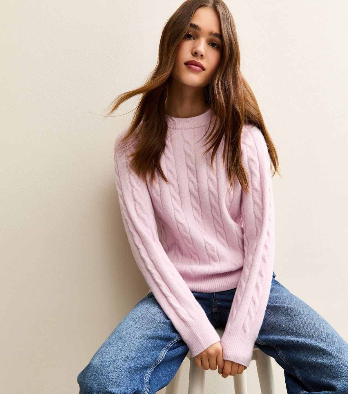 The New Look Light Pink Cable Knit Crew Neck Jumper is available in sizes 10, 20, 22.