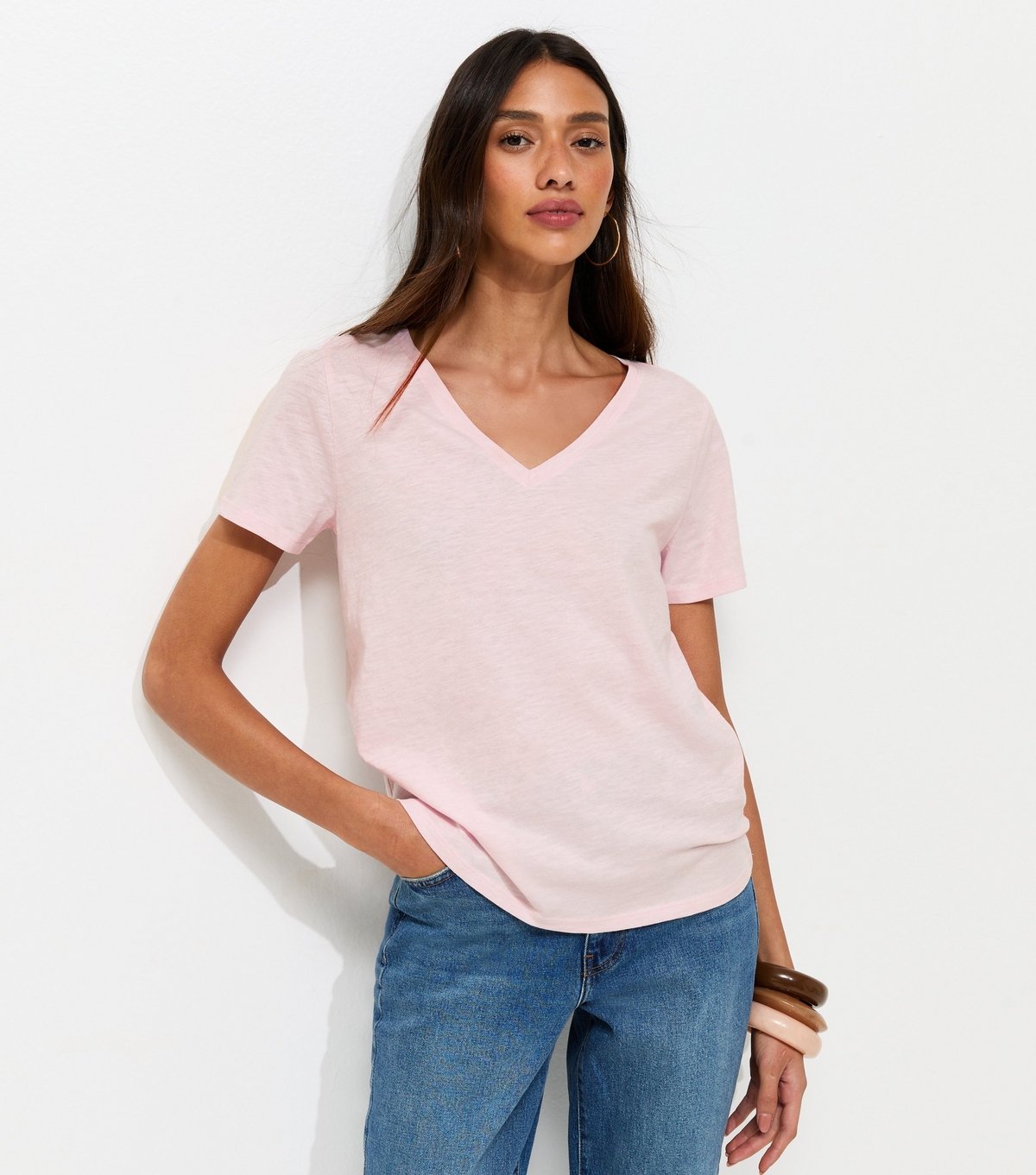 The New Look Light Pink Cotton V-Neck T-Shirt is ideal for casual, everyday, date-night.