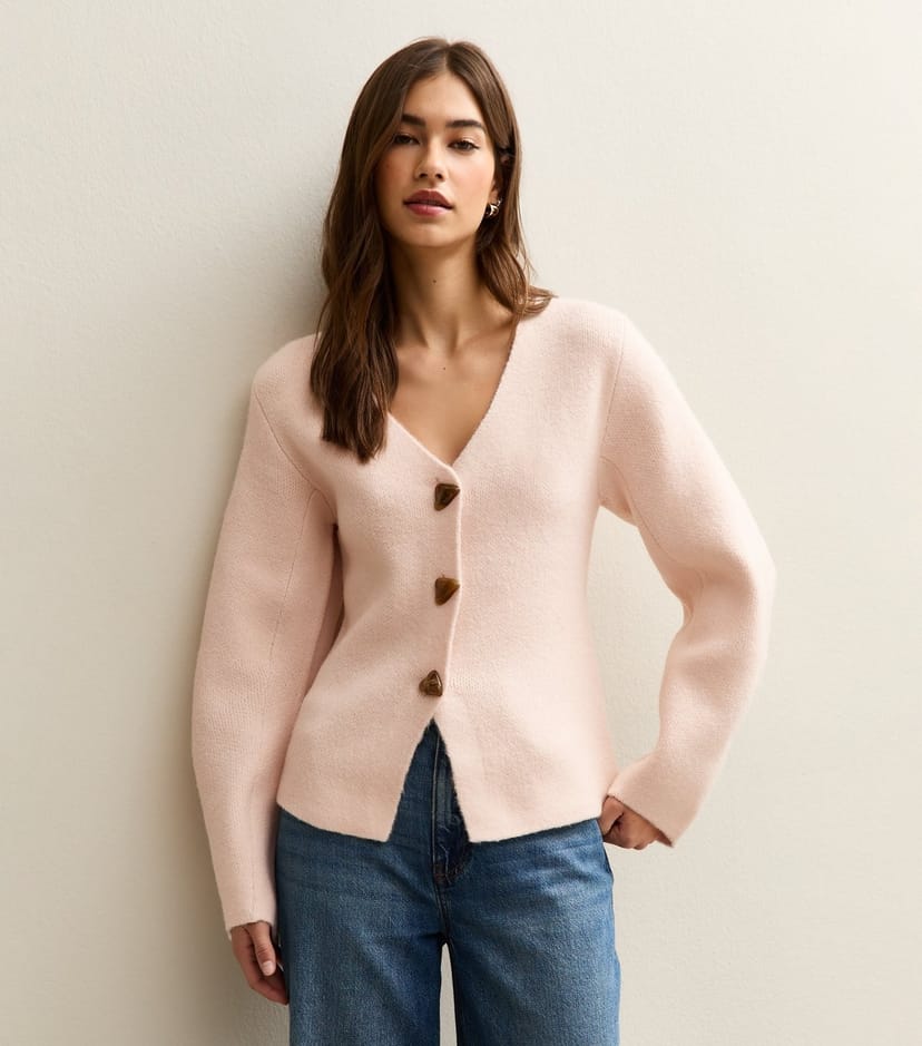 This light pink heavyweight knit cardigan from New Look features a soft V-neckline and long sleeves. It secures with brown triangular buttons for a cosy and stylish addition to your knitwear collection.